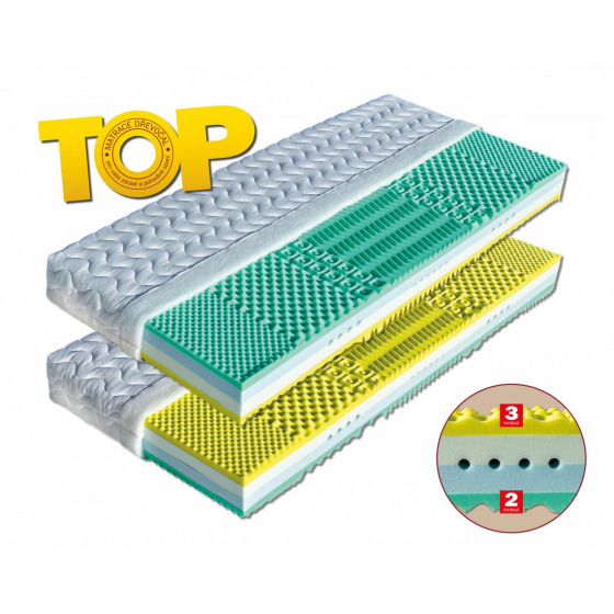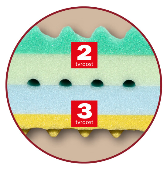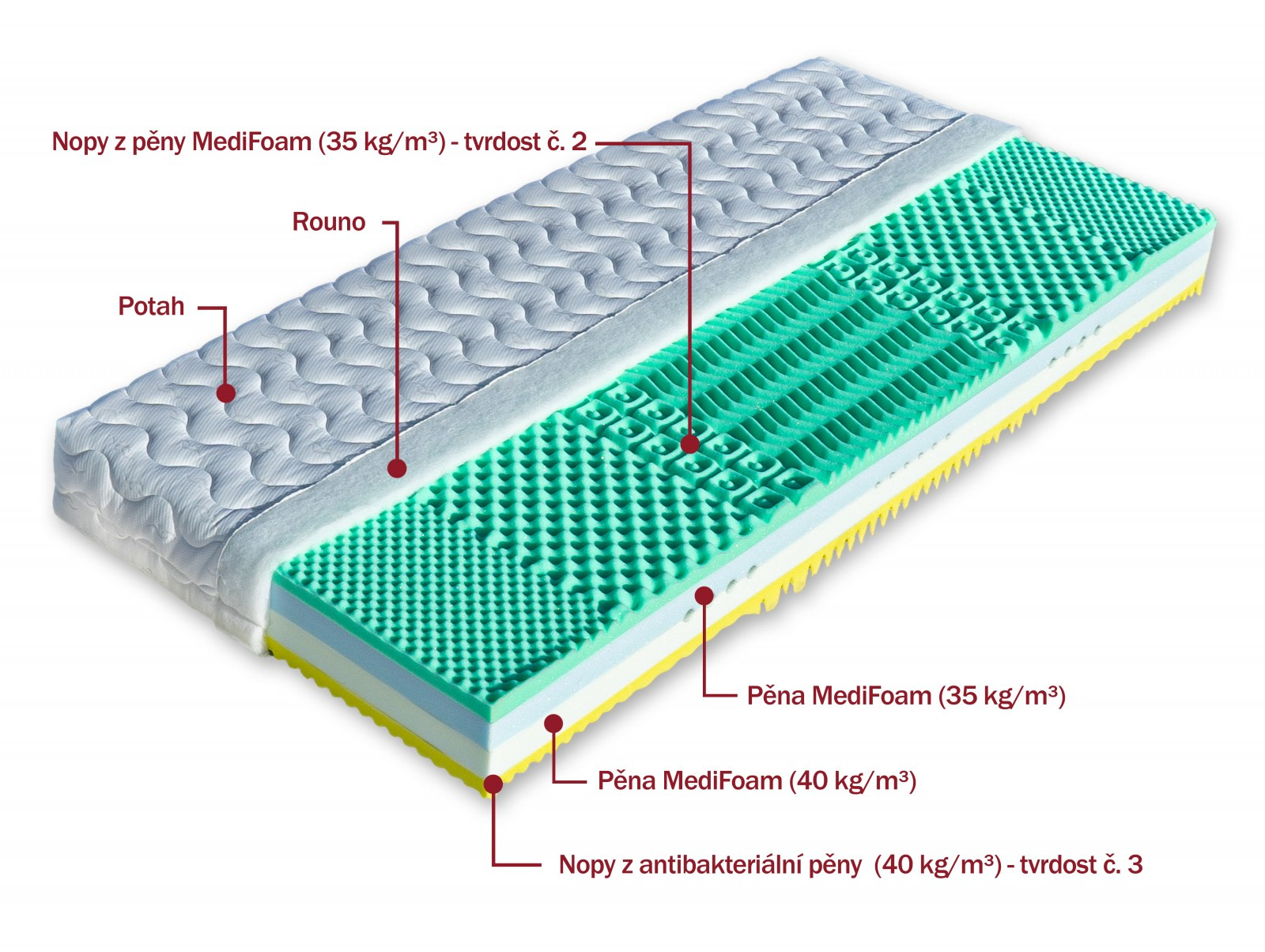 Jádro matrace je tvořeno kombinací desek dvou elastických pěn s odlišnou tuhostí. Střed jádra tvoří příčné průduchy, které zajišťují provzdušnění matrace. Nosné vrstvy jsou oboustranně tvořeny ze studené pěny s příměsí oleje ze skočce obecného v různých tuhostech. Vrstvy jsou tvarované do masážních nopů v sedmi zónách. Matraci je vhodné položit na pevný nebo polohovací lamelový rošt.