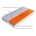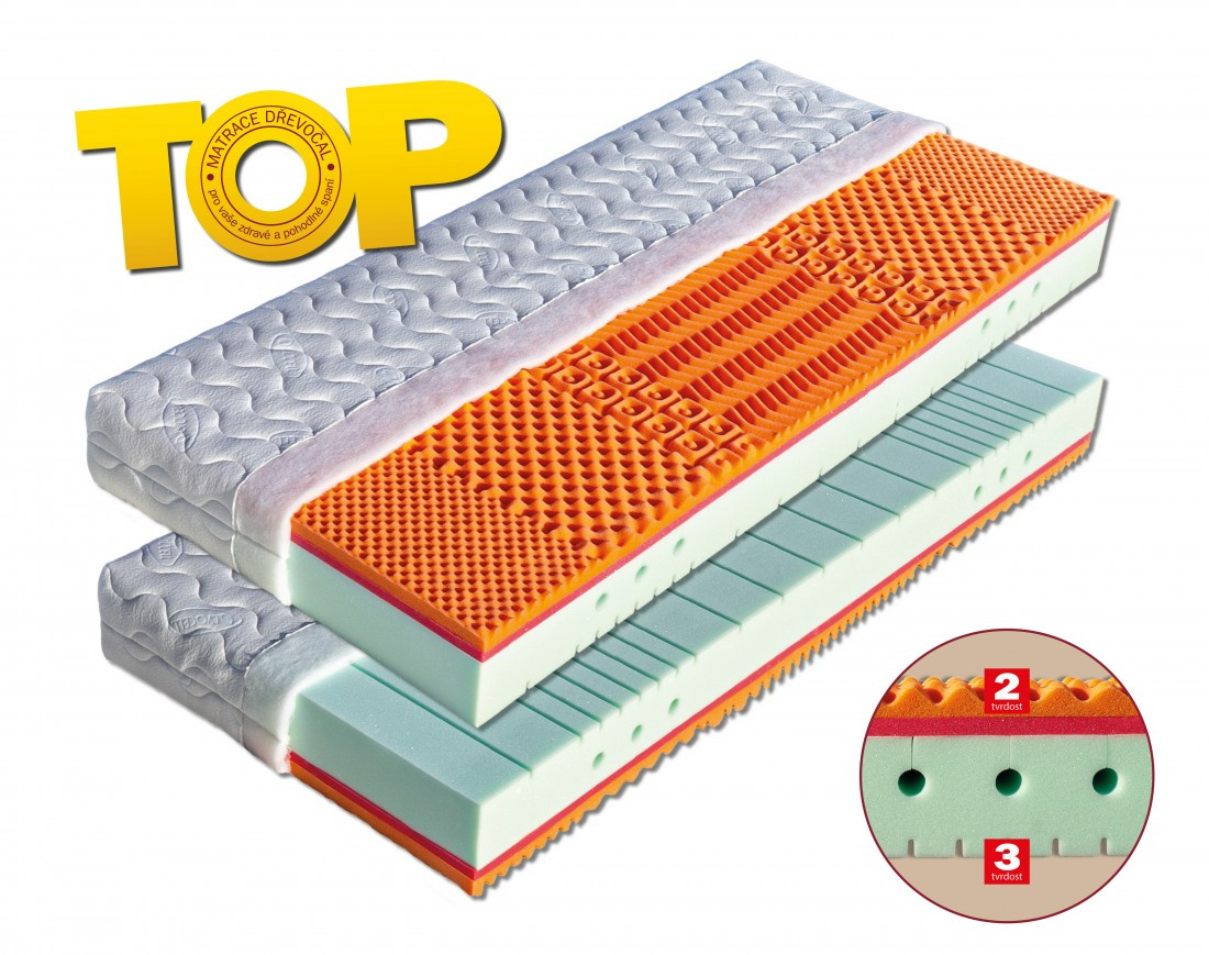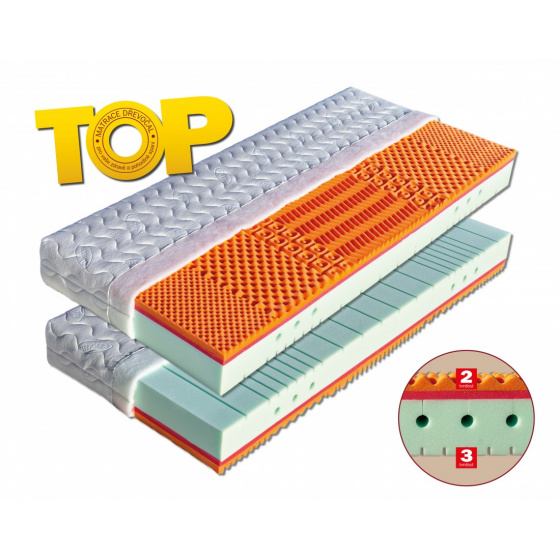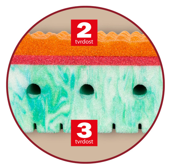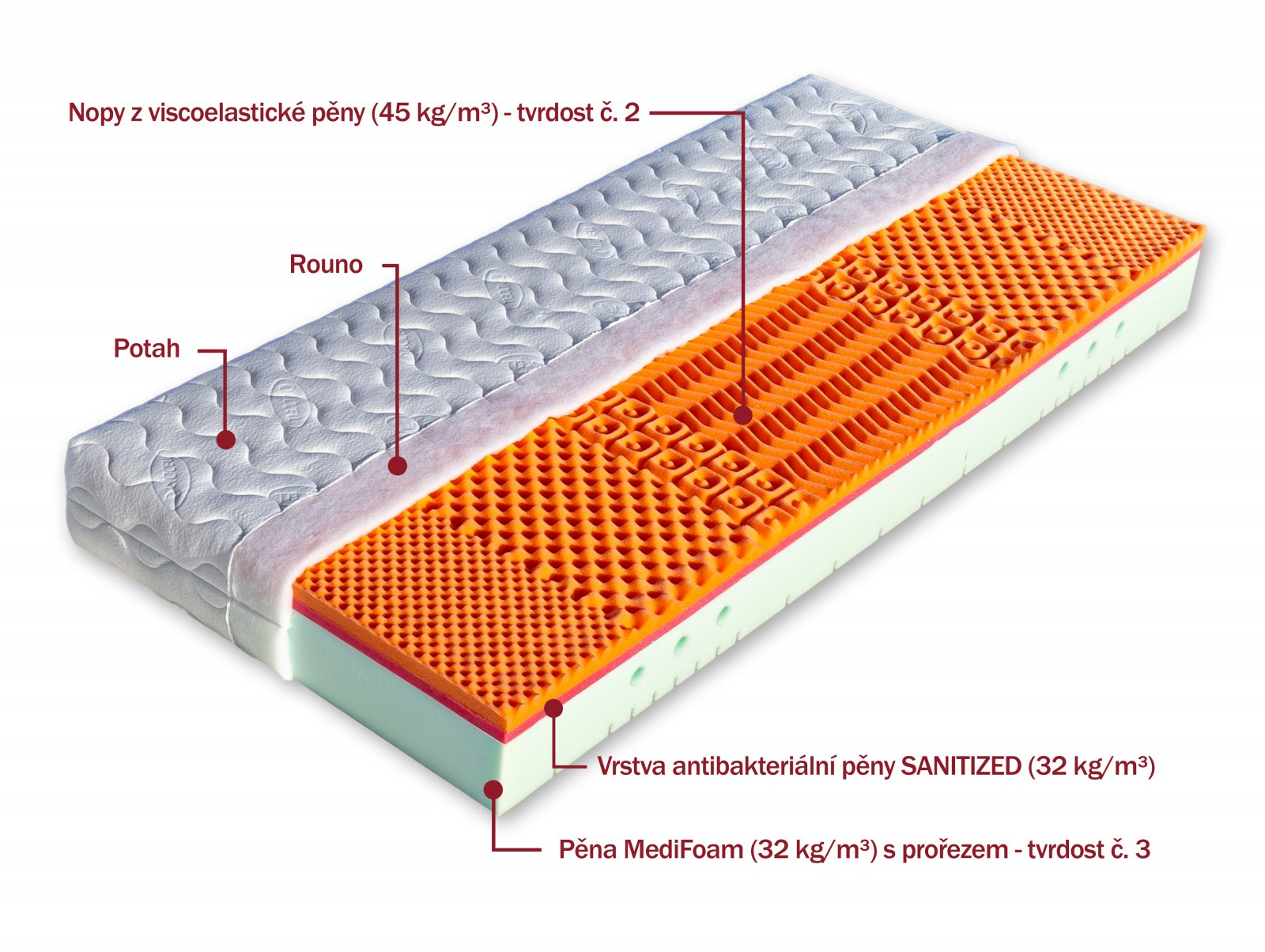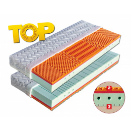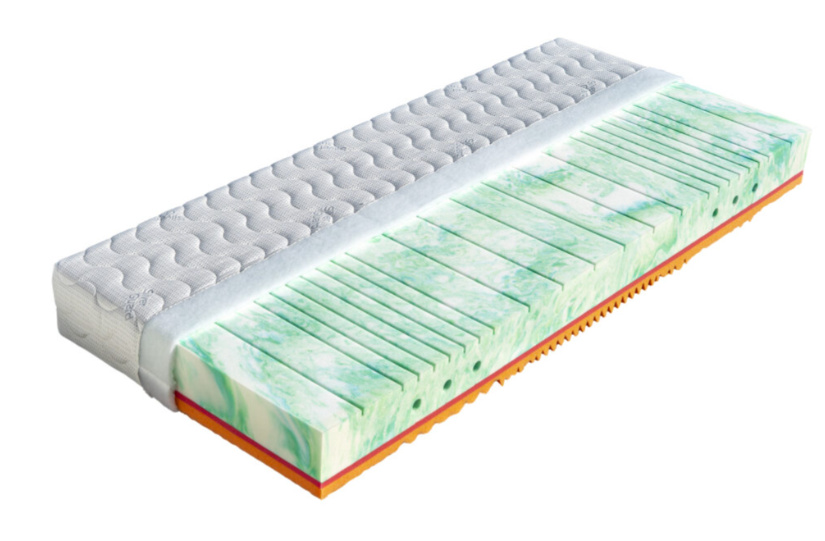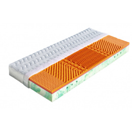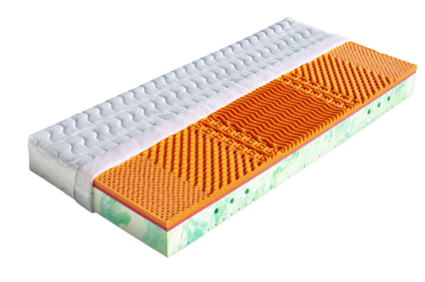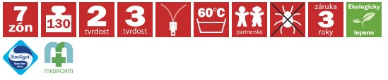 Sedmizónová matrace s hráškově žíhanou pěnou MediFoam (38 kg/m³), která má zónovité prořezy a tvrdost č. 3. Navíc její otvory v místech pod rameny vytvářejí tzv. ramenní kolébku – ideální pro spaní na boku. Horní stranu změkčuje viscoelastická pěna (45 kg/m³), která mění svou tuhost v závislosti na teplotě. Rovnoměrně rozkládá tlak materiálu na ležící tělo a nevytváří protitlak. Pohodlný spánek a relaxaci zaručuje tvarování do masážních nopů. Ke zvýšení komfortu je navíc podepřena červenou antibakteriální pěnou (32 kg/m³) s úpravou Sanitized pro ochranu proti bakteriím a roztočům. Matrace je vhodná na všechny typy roštů.