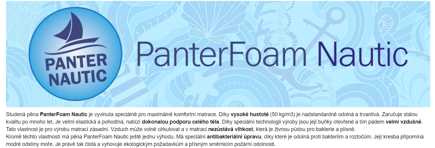 Luxusní matrace s volbou dvojí tvrdosti. Jádro matrace tvoří profilovaná studená HR pěna (40 kg/m³) společně s pěnou MediFoam (35 kg/m³). Ložné plochy tvoří dvě pěny. Pěna PanterFoam (50 kg/m³) šedé barvy, s vysokou elasticitou a tvarovou stálostí, a pěna PanterFoam Nautic (50 kg/m³) modré barvy. Tato pěna modré barvy má navíc antibakteriální úpravu, díky které je odolná vůči bakteriím a roztočům. Dobrá ventilace zajistí pocit čistoty a svěžesti. Je vhodná pro všechny typy roštů.