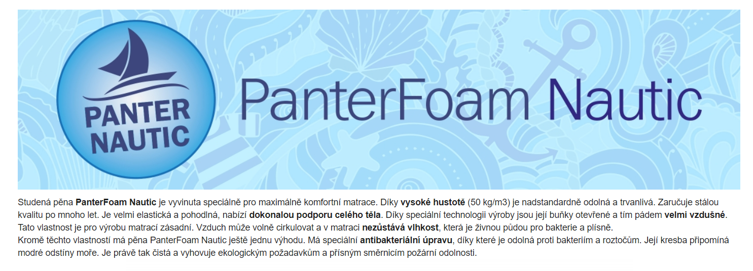 Partnerská matrace dvojí tvrdosti z velmi kvalitních studených pěn, které se vyznačují dlouhou životností. Pouhým otočením matrace zvolíte její tvrdost. Vrchní strana, s tvrdostí č. 2, je tvořena značkovou studenou pěnou PanterFoam Nautic (50 kg/m³), která přináší to nejlepší pro Váš spánek. Její vysoká hustota zabezpečí nadstandardní odolnost. Díky speciální technologii výroby jsou její buňky otevřené, a proto velmi vzdušné. Navíc má speciální antibakteriální úpravu, díky které je