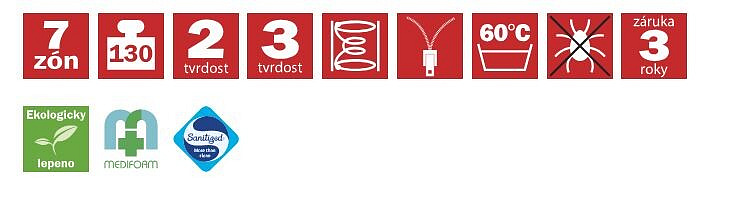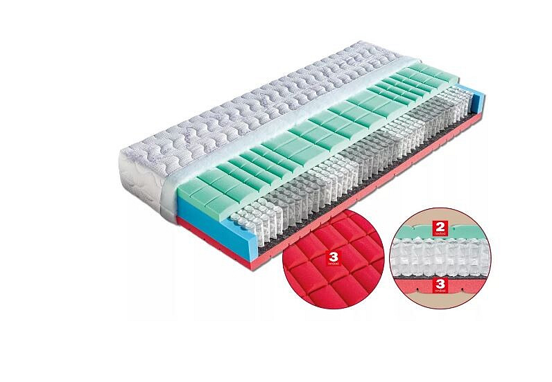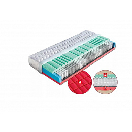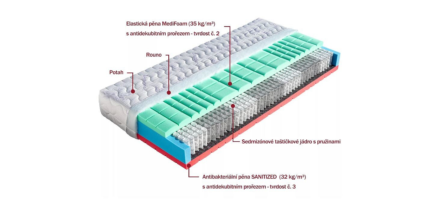 Jedná se o komfortní matraci s dvojí tuhostí a vynikajícími ortopedickými vlastnostmi. Vrchní tyrkysově zelená vrstva je tvořena elastickou pěnou MediFoam (35 kg/m³), která má tuhost č. 2. Pevnější červená pěna (32 kg/m³) má antibakteriální úpravu Sanitized s trvalou ochranou proti bakteriím, tuhost č. 3. Obě pěny mají antidekubitní prořez, takže se ideálně tvarují podle každé polohy těla. Taštičkové jádro vytváří maximální komfort pro perfektní odpočinek a spánek. Hlavní předností taštičkových matrací je jejich vzdušnost a dokonalé kopírování tvaru páteře. Matrace může být položena na všechny typy roštů, dokonce i na pevnou desku nebo motorový rošt.
