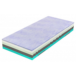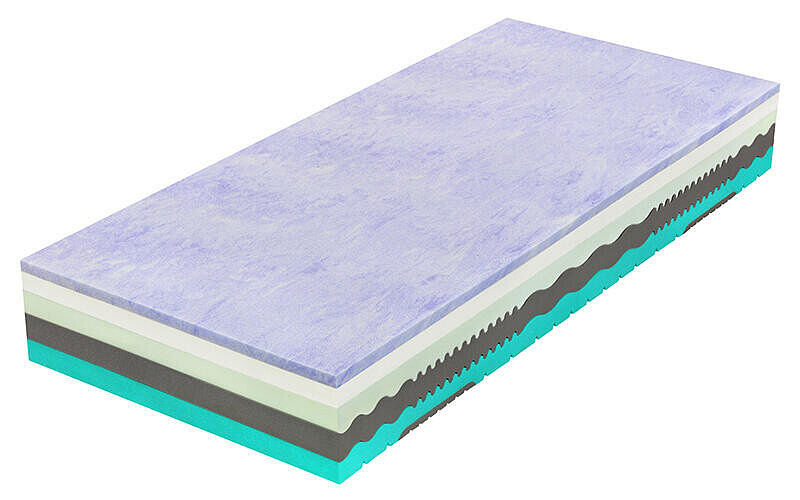 Základna z pěn HYBRID HY 38 kg/m3 super-elastická hybridní pěna střední tuhosti - vyrovnává tlak; celoplošný anatomický systém SpineProtector pro ochranu páteře; HR-XF 50 kg/m3 tuhá a pružná studená pěna.Reverzní strana matrace s ramenními sekcemi a CubeCare profilací (výkyvné flexi kostky) proti otlakům.