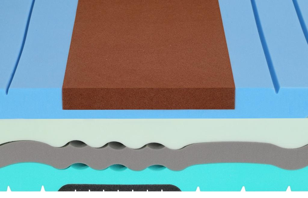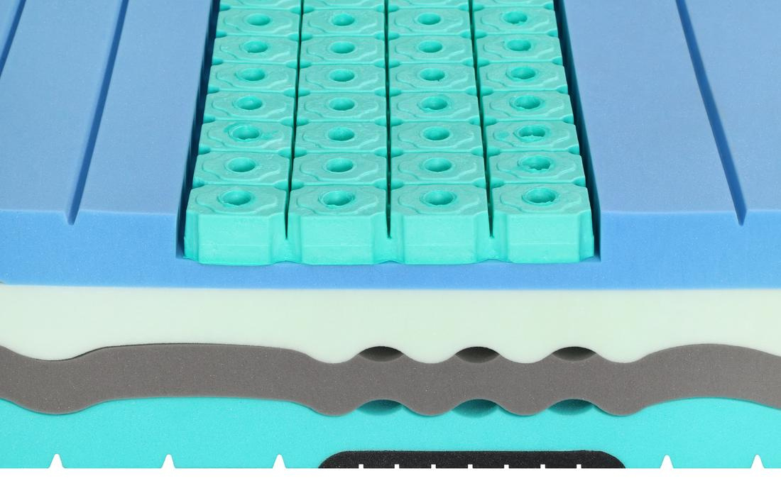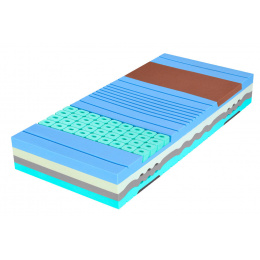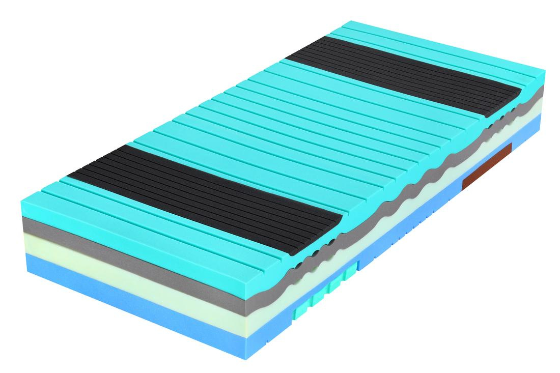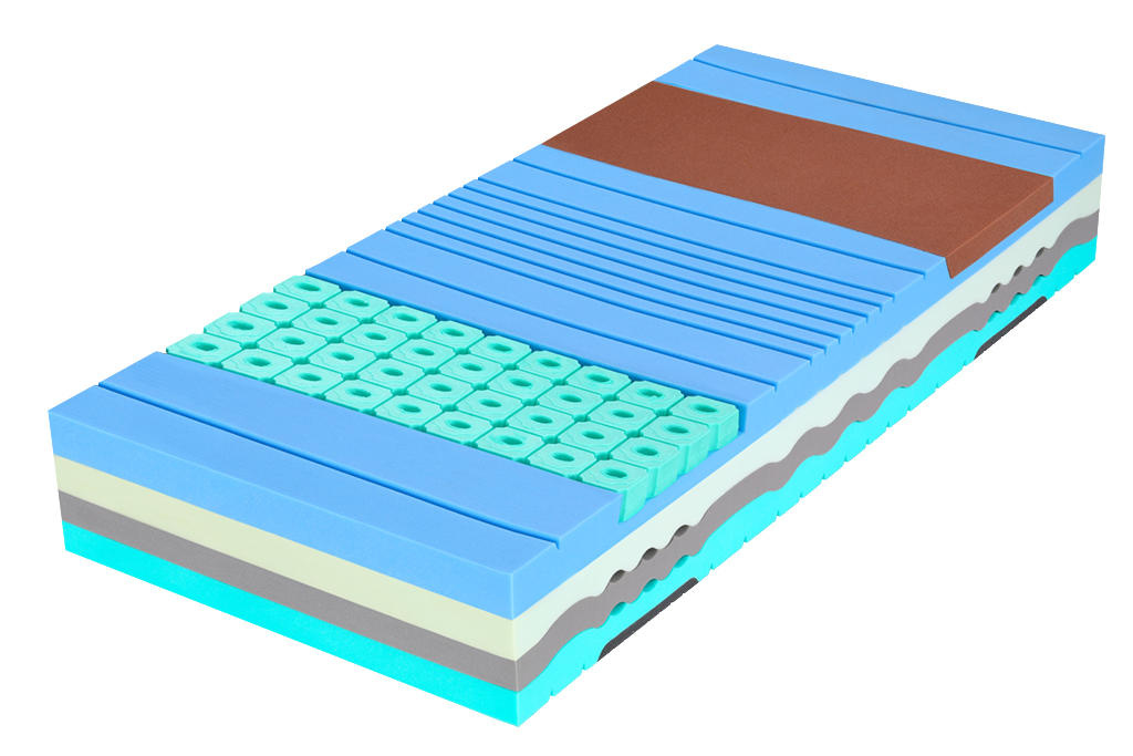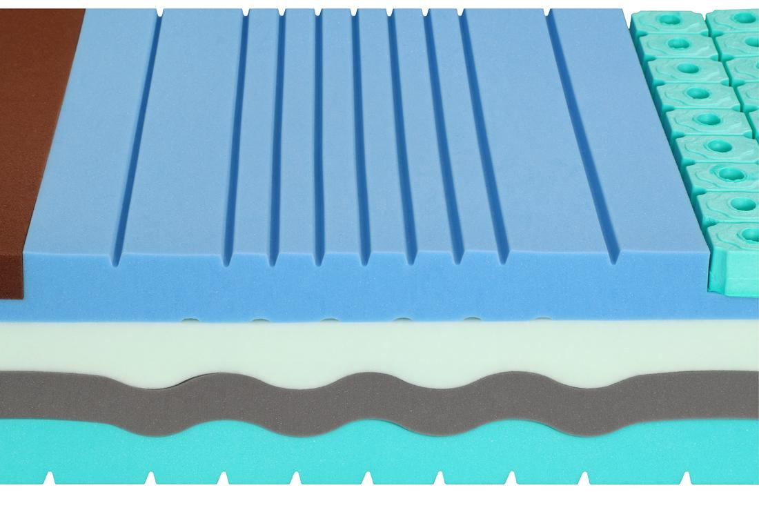 Základna z pěn HYBRID HY 38 kg/m3 super-elastická hybridní pěna střední tuhosti - vyrovnává tlak v ploše matrace. HR-XF 40 kg/m3 studená pěna je tvarována do ergonomické vrstvy SpineProtector2 pro ochranu páteře. HR-XF 50 kg/m3 studená pěna. Tuhost a vysoká pružnost (snadná změna poloh). Tvoří tužší stranu matrace s profilací CubeCare, vyvinutou pro zdravotní matrace. Pomáhá omezit tlak na tělo, a to i přes vysokou tuhost.