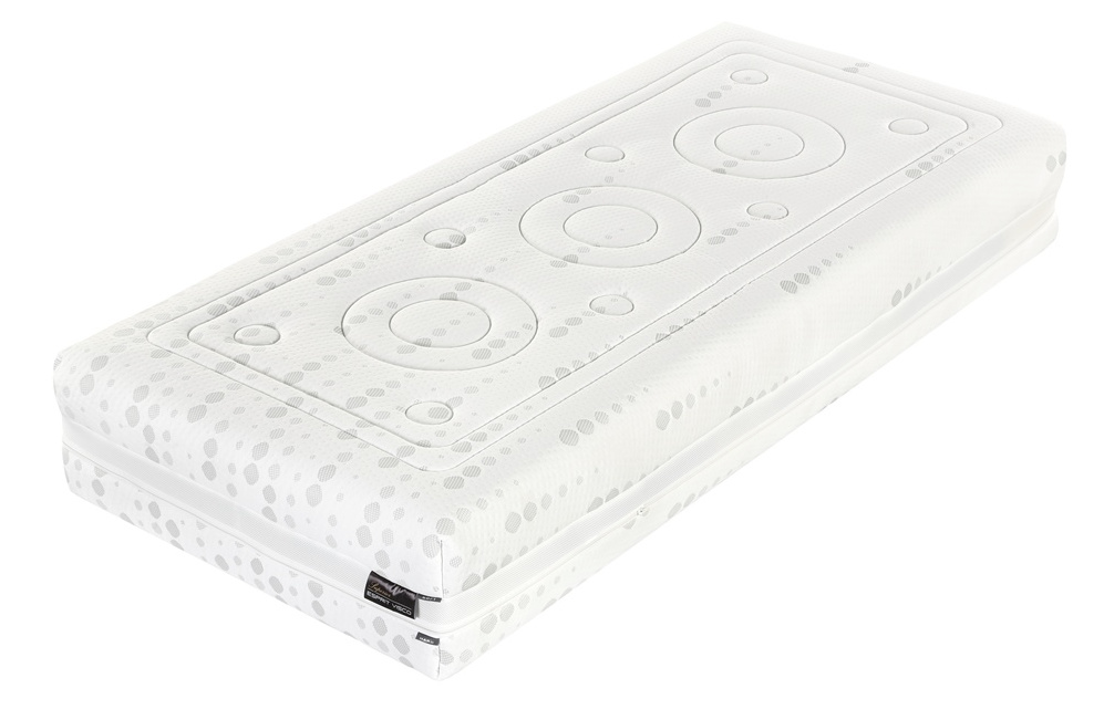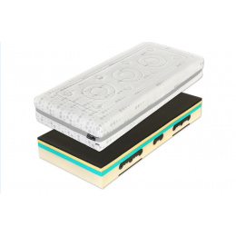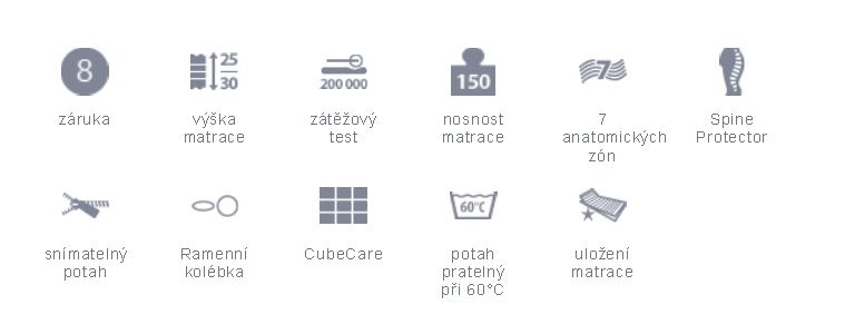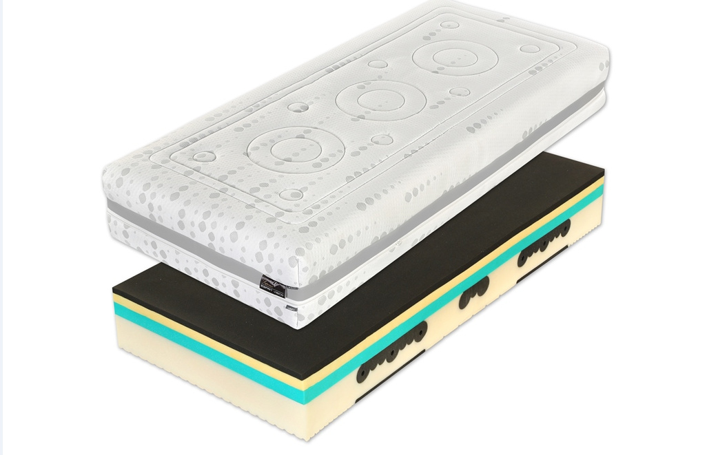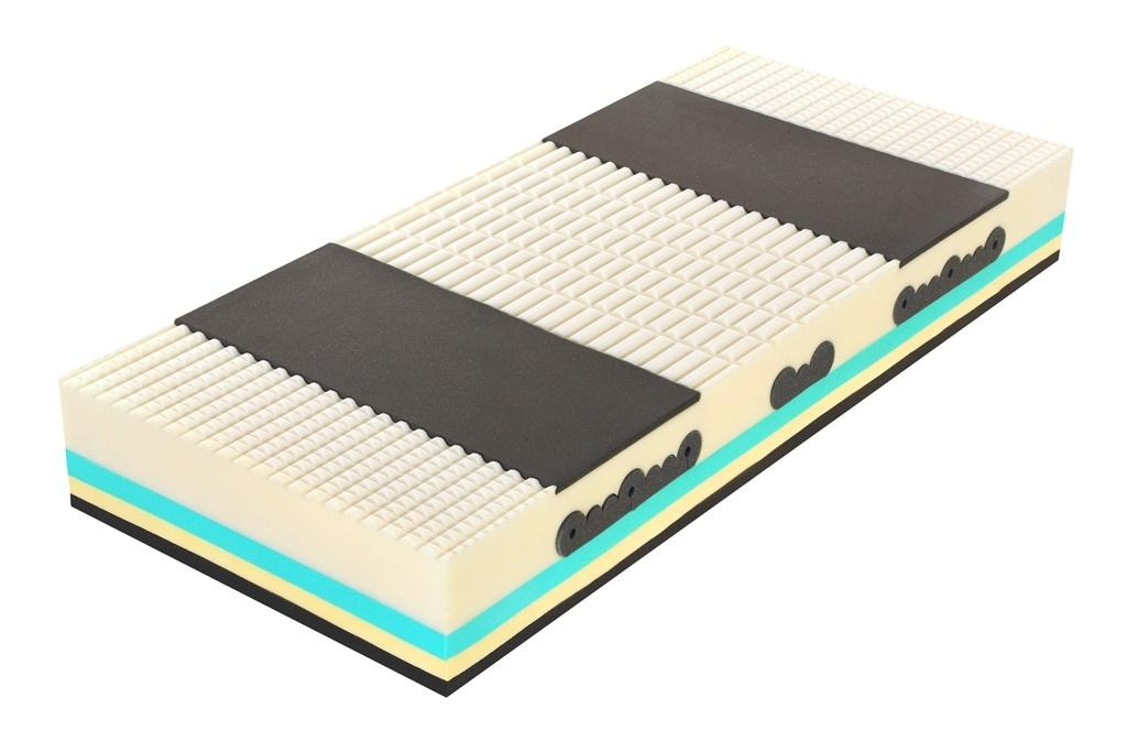 Základna z pěny Flexifoam® SuperiorVolume vysokého objemu s anatomickým systémem SpineProtector (ramenní a pánevní roznášecí zóny nesou tělo ve všech nálehových úhlech a upravují tuhost v zónách).Reverzní strana matrace s ramenními sekcemi a CubeCare profilací (výkyvné flexi kostky) proti otlakům.