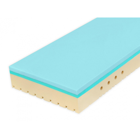 Hybridní pěna Blue spojuje ty nejlepší vlastnosti studené i paměťové pěny a latexu: Je pružná, prodyšná, má optimální tuhost, vynikající termoregulaci, pomáhá omezit pocení a je super odolná.