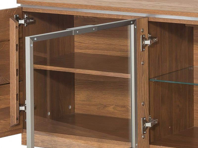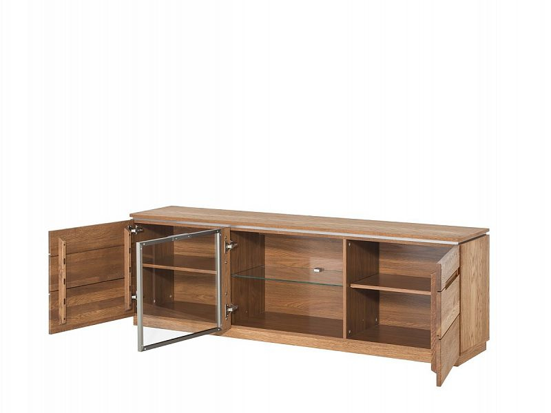 MONET komoda nízká - třídvéřová, prostřední dvířka prosklená, policová. Sklo je tvrzené, uchycené v kovovém rámu.