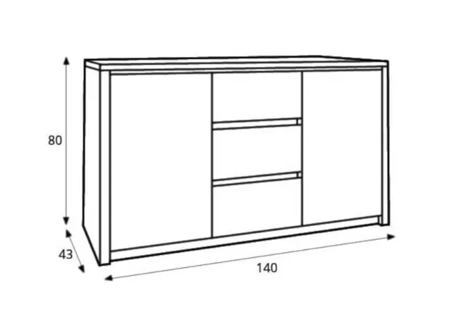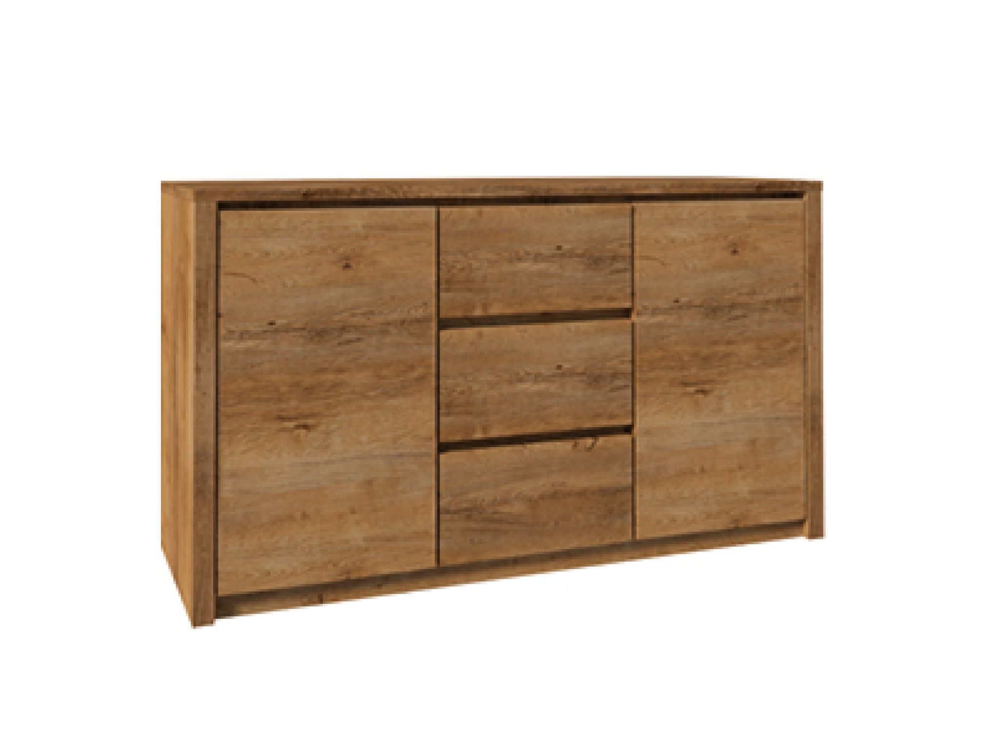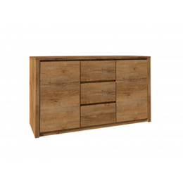 Komoda K2DP - uprostřed tři šuplíky, po stranách plné dvířka a police ( za každými dvířky jedna )