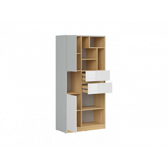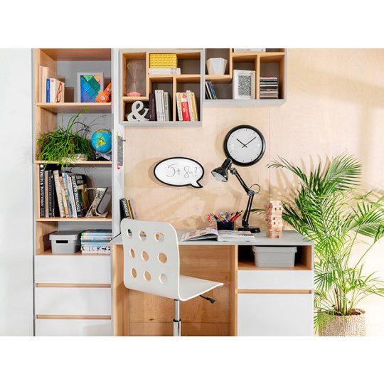 Moderní nábytkový systém NANDU se vyznačuje jednoduchou, vzdušnou formou a designovými detaily předních čel zásuvek, které dodávají nábytku originální a trendový vzhled. Univerzální kombinace barev šedá, dub polský a bílý lesk budou základem pro stylové bydlení. Bezúchytkové čelní plochy dodávají nábytku z kolekce NANDU na elegantnosti. Moderní kolekce NANDU usnadní uspořádání studentského a dospívajícího pokoje.