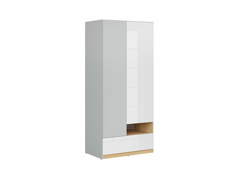Šatní skříň ze systému NANDU - dvoudveřová s policemi a šatní tyčí, otevřená police, spodní prostorná zásuvka