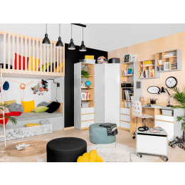 Moderní nábytkový systém NANDU se vyznačuje jednoduchou, vzdušnou formou a designovými detaily předních čel zásuvek, které dodávají nábytku originální a trendový vzhled. Univerzální kombinace barev šedá, dub polský a bílý lesk budou základem pro stylové bydlení. Bezúchytkové čelní plochy dodávají nábytku z kolekce NANDU na elegantnosti. Moderní kolekce NANDU usnadní uspořádání studentského a dospívajícího pokoje.