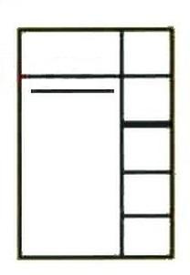 Šatní skříň 01 ze systému NEMO - kombinovaná. V jedné části šatní tyč a jedna police nad ní, v druhé dvoje dvířka nad sebou s policemi a uprostřed dva šuplíky.