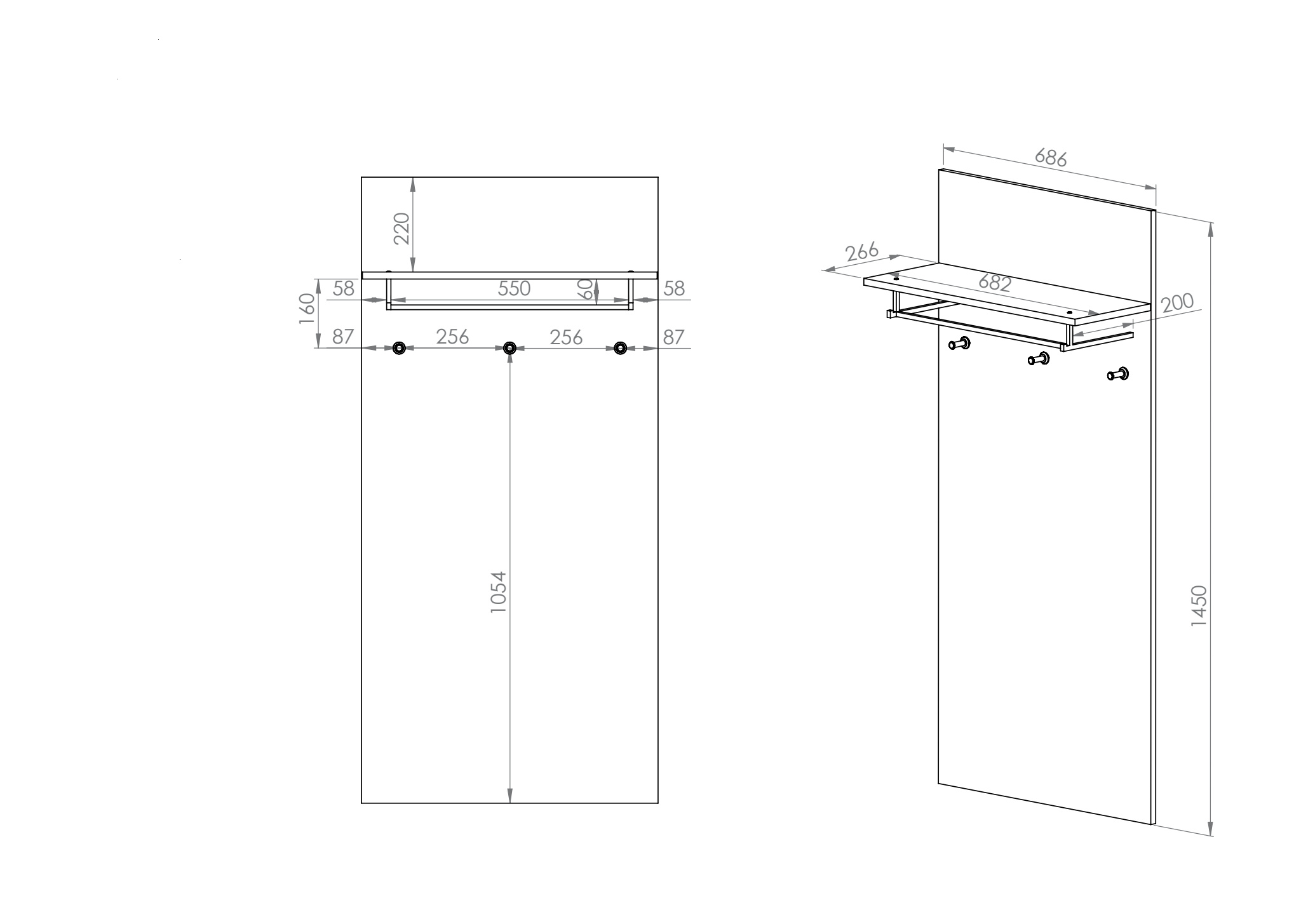 NEVIO věšákový panel 15 - nástěnný věšák se třemi háčky a policí