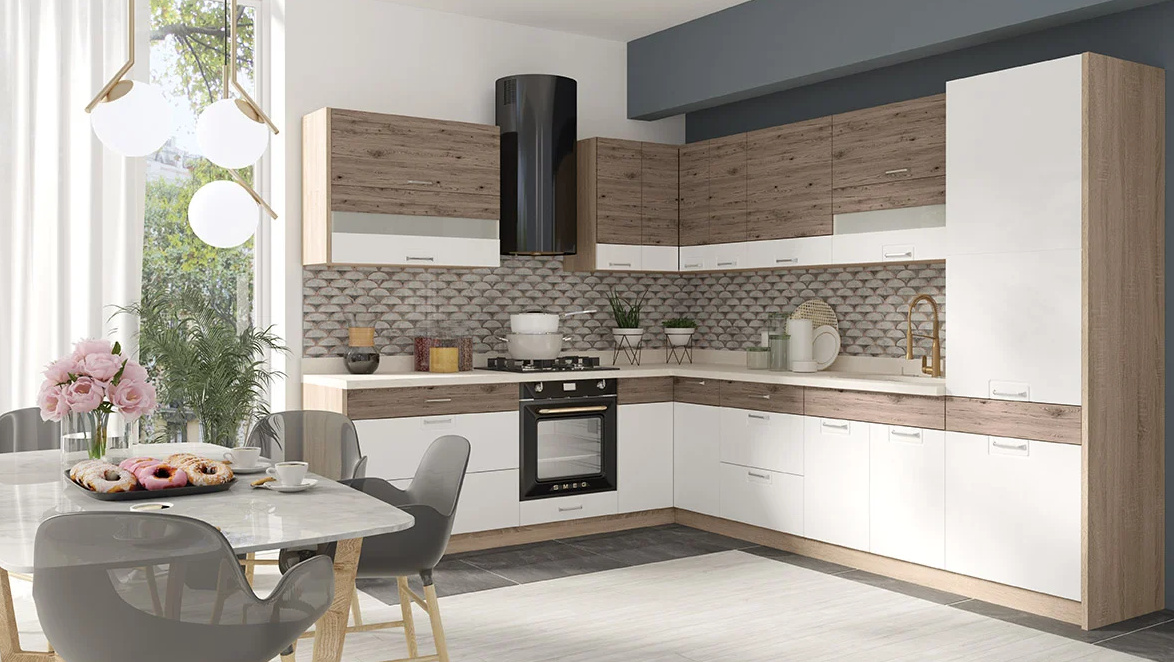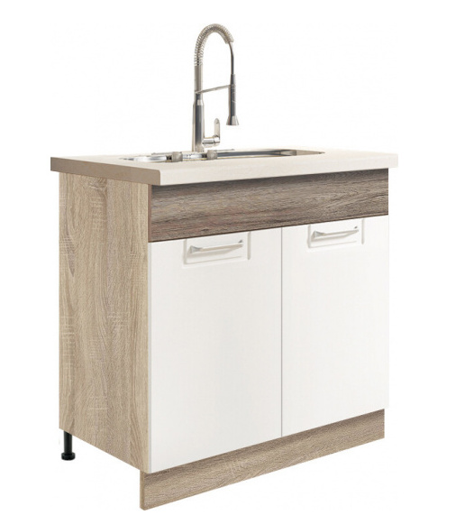 Kuchyňské skříňky jsou dodávány v demontu s návodem k montáži. Bez dřezu, vodovodní baterie, spotřebičů a dekorací