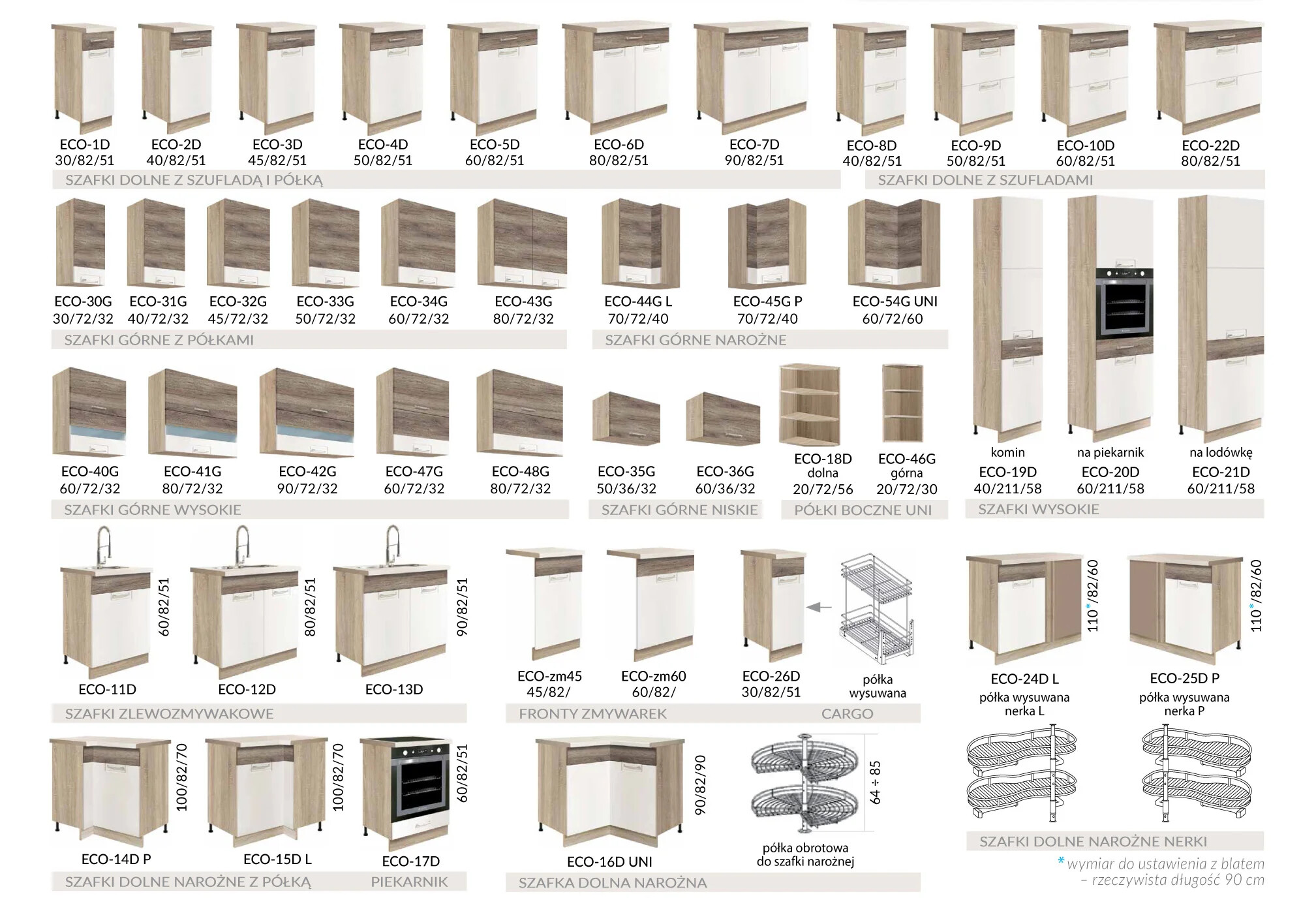 Spodní kuchyňské skříňky se dodávají bez soklu a bez pracovní desky, které si můžete vybrat z naší nabídky.