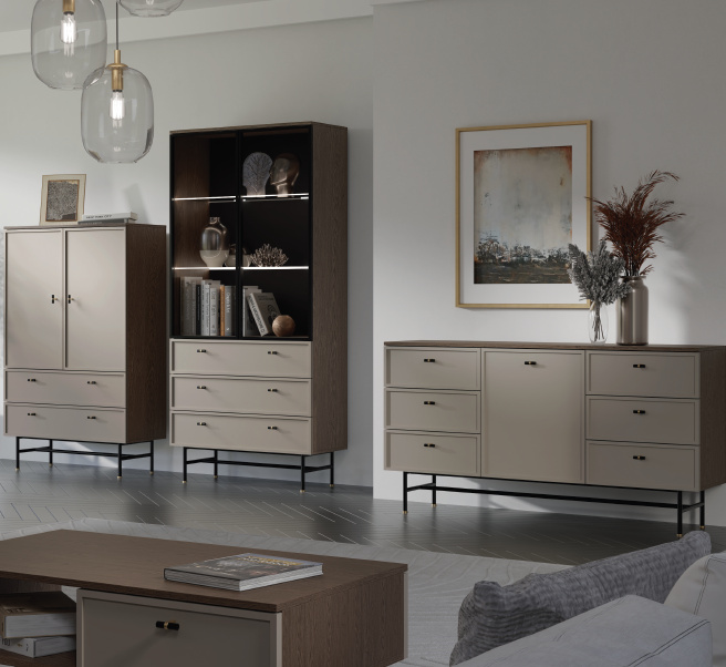 ELORA systémový nábytek do obývacího pokoje. Vkusný, jednoduchý, elegantní. Moderní nábytek do obývacího pokoje ELORA vyniká nadčasovým, minimalistickým designem, který dokonale splňuje náročné interiérové požadavky. Hladké linie a jedinečná kombinace barevného provedení baltic storm a toffi vytvářejí silný dekorativní prvek. Široké možnosti uspořádání, které tato sada nábytku do obývacího pokoje nabízí, jí dodávají všestranný a univerzální charakter, který se hodí do moderních i klasických interiérů. Výběr nábytku není určen pouze jeho vzhledem, ale také jeho funkčností. Moderní sektorový nábytek do obývacího pokoje ELORA je vyroben z vysoce kvalitních materiálů, což zaručuje jeho trvanlivost, pevnost a vysokou odolnost proti poškození. Poskytuje dostatek úložného prostoru, pomáhá optimalizovat a pohodlně organizovat prostor a přizpůsobuje se Vašim individuálním potřebám.
