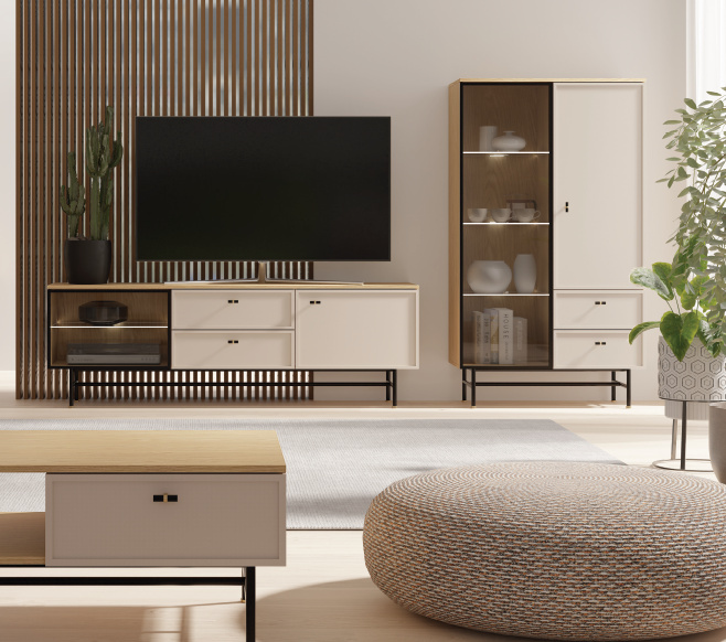 ELORA systémový nábytek do obývacího pokoje. Vkusný, jednoduchý, elegantní. Moderní nábytek do obývacího pokoje ELORA vyniká nadčasovým, minimalistickým designem, který dokonale splňuje náročné interiérové požadavky. Hladké linie a jedinečná kombinace barevného provedení dub jarní a macadamia vytvářejí silný dekorativní prvek. Široké možnosti uspořádání, které tato sada nábytku do obývacího pokoje nabízí, jí dodávají všestranný a univerzální charakter, který se hodí do moderních i klasických interiérů. Výběr nábytku není určen pouze jeho vzhledem, ale také jeho funkčností. Moderní sektorový nábytek do obývacího pokoje ELORA je vyroben z vysoce kvalitních materiálů, což zaručuje jeho trvanlivost, pevnost a vysokou odolnost proti poškození. Poskytuje dostatek úložného prostoru, pomáhá optimalizovat a pohodlně organizovat prostor a přizpůsobuje se Vašim individuálním potřebám.