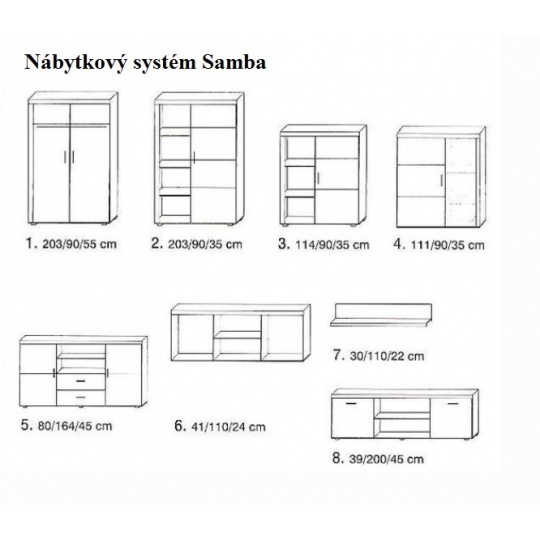Systémový nábytek SAMBA se skládá z 8 dílů, sami si tak můžete sestavit obývací či studentský pokoj na míru. SAMBA je moderní nábytkový sektor za velmi příznivé ceny. Nábytek SAMBA se vyrábí z kvalitního lamina ve třech barevných kombinacích San Marino / krémová, švestka / krémová a švestka grafit.