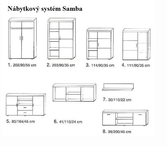 Systémový nábytek SAMBA se skládá z 8 dílů, sami si tak můžete sestavit obývací či studentský pokoj na míru. SAMBA je moderní nábytkový sektor za velmi příznivé ceny. Nábytek SAMBA se vyrábí z kvalitního lamina ve třech barevných kombinacích San Marino / krémová, švestka / krémová a švestka grafit.