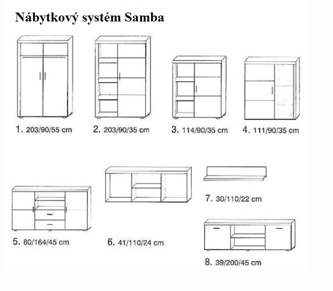 Systémový nábytek SAMBA se skládá z 8 dílů, sami si tak můžete sestavit obývací či studentský pokoj na míru. SAMBA je moderní nábytkový sektor za velmi příznivé ceny. Nábytek SAMBA se vyrábí z kvalitního lamina ve třech barevných kombinacích San Marino / krémová, švestka / krémová a švestka / grafit.