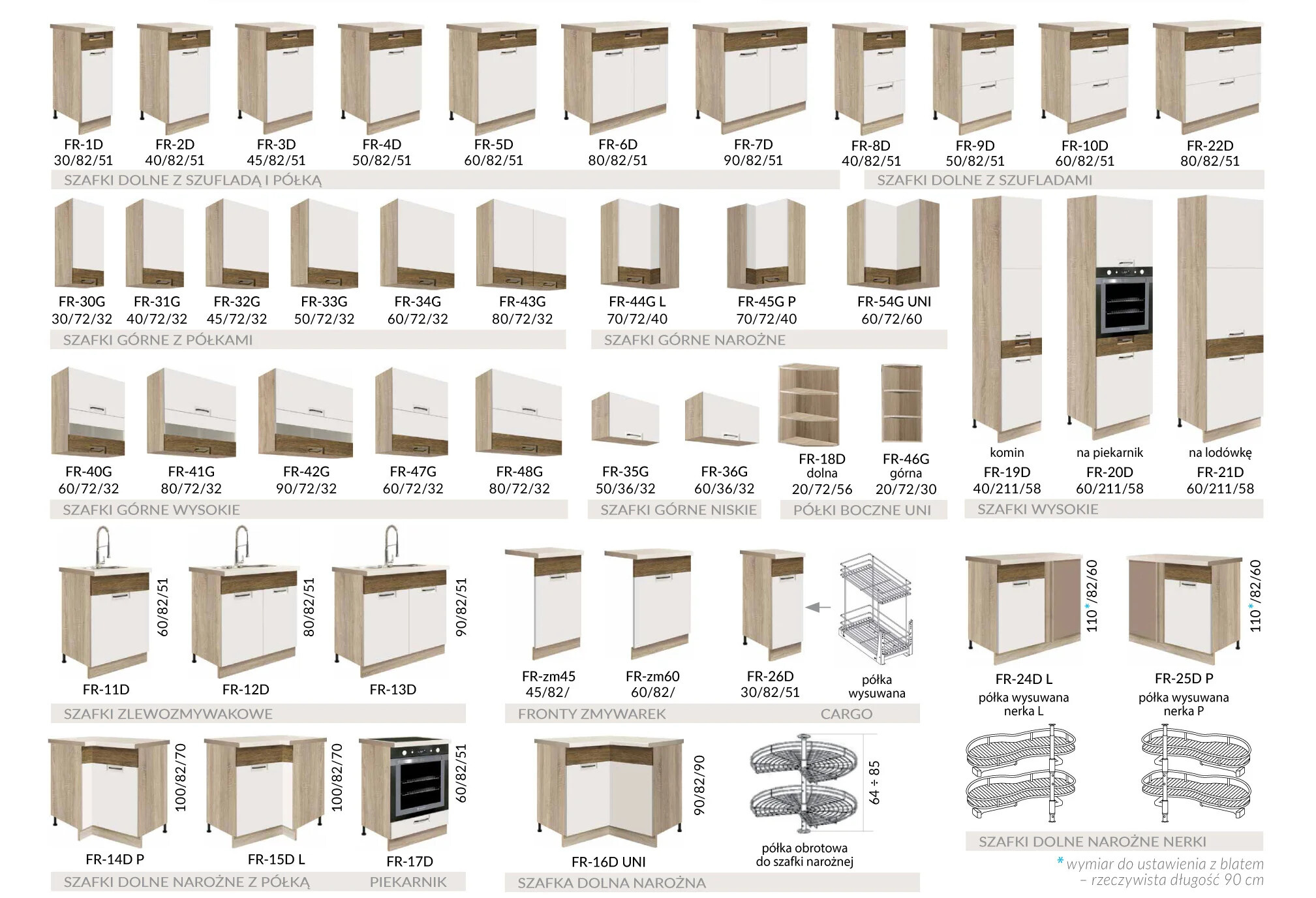 Spodní kuchyňské skříňky se dodávají bez soklu a bez pracovní desky, které si můžete vybrat z naší nabídky.