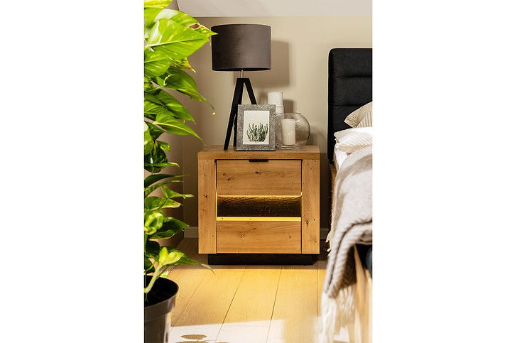 Nábytek OSTIA je vyroben v teplých tónech dubu artisan z vysoce kvalitního lamina, přičemž je tento materiál zvýrazněn a dotvořen MDF hranami. Charakteristickým rysem tohoto nábytku jsou dekorační vnitřní pásky v barevném provedení černý dub/černý lesk. Jednoduchý styl umocňuje LED pásek, který doplňuje černou dekorační lištu. Zásuvky jsou pro jejich snadnější otevírání opatřeny matnými, černými rukojetěmi a systémem tichého a plynulého dovírání. Systém OSTIA nabízí mnoho nejrůznějších typů nábytku. Tento široký výběr vám zaručí vybavení interiéru podle vašich představ.
