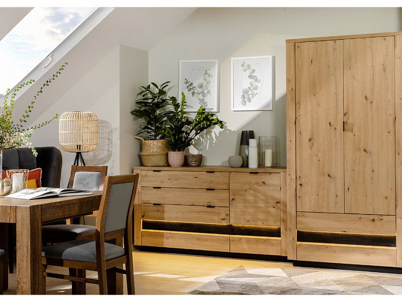 Nábytek OSTIA je vyroben v teplých tónech dubu artisan z vysoce kvalitního lamina, přičemž je tento materiál zvýrazněn a dotvořen MDF hranami. Charakteristickým rysem tohoto nábytku jsou dekorační vnitřní pásky v barevném provedení černý dub/černý lesk. Jednoduchý styl umocňuje LED pásek, který doplňuje černou dekorační lištu. Zásuvky jsou pro jejich snadnější otevírání opatřeny matnými, černými rukojetěmi a systémem tichého a plynulého dovírání. Systém OSTIA nabízí mnoho nejrůznějších typů nábytku. Tento široký výběr vám zaručí vybavení interiéru podle vašich představ.
