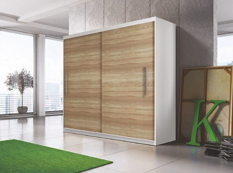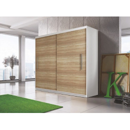Prostorná šatní skříň OTAVA je vyrobena z kvalitního lamina v dekoru dub sonoma s bílým korpusem. Vnitřní členění je zhotoveno prakticky na část policovou a část s šatní tyčí.