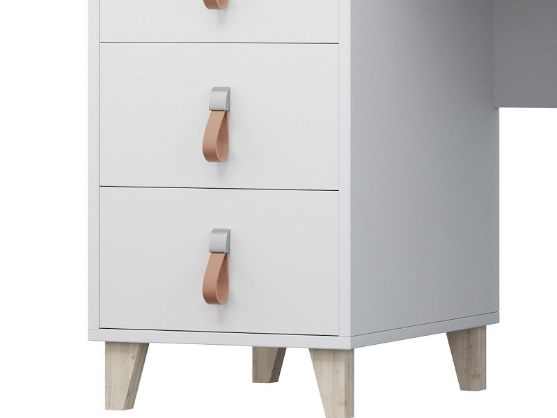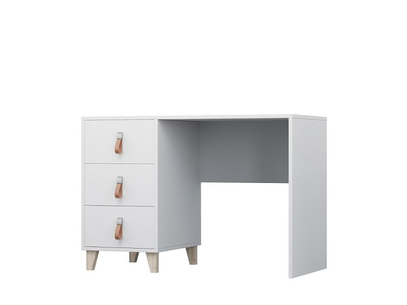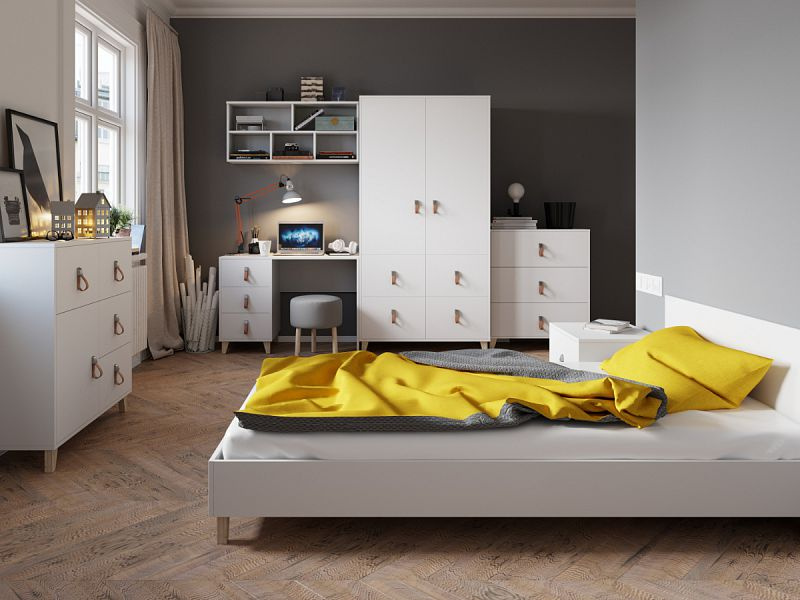 PLUTO je systémový nábytek určený pro vybavení studentských a dětských pokojů. Nábytek je vyroben z kvalitního lamina v nadčasovém bílém provedení, je postaven na vysoké dřevěné nožičky a jako elegantní doplněk jsou kožené úchyty.