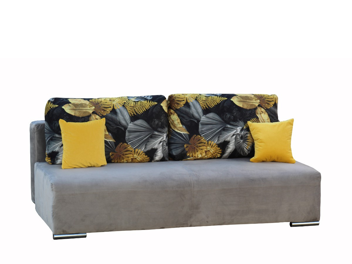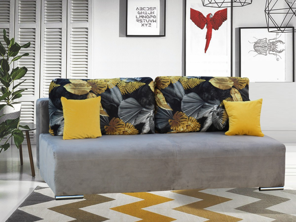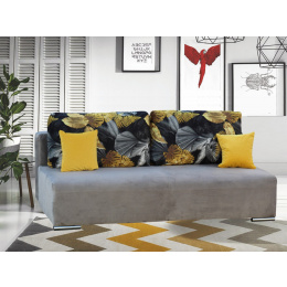Rozkládací pohovka BENNY je očalouněna příjemnou potahovou látkou šedá / šedožluté listy. Pohodlí při odpočinku zajišťuje výplň v sedáku - PUR pěna, bonell pružina. Pohovka má praktický úložný prostor, ozdobné polštáře. Pohovka je rozkládací, přičemž je vhodná na denní spaní. Funkce jednoduchého rozkladu v automatu. Spací plocha je 135 x 190 cm.