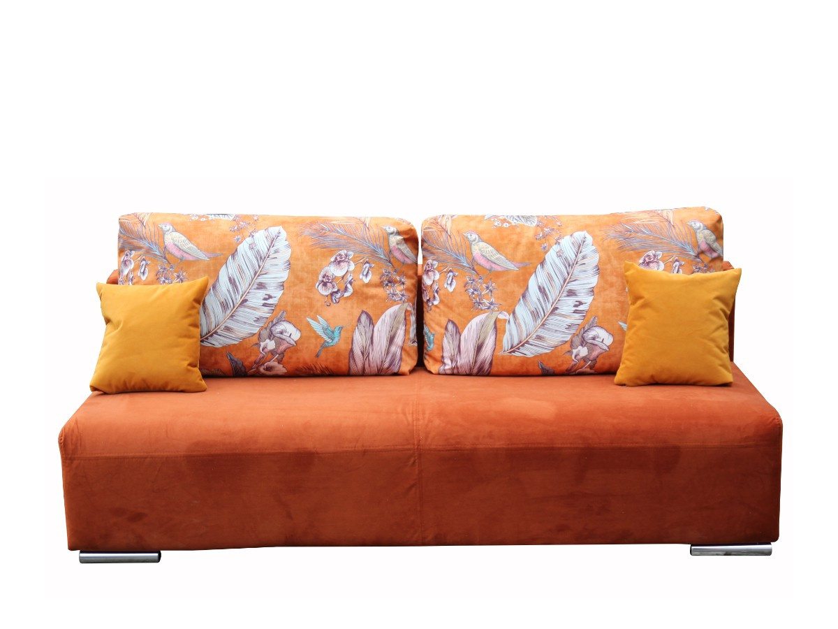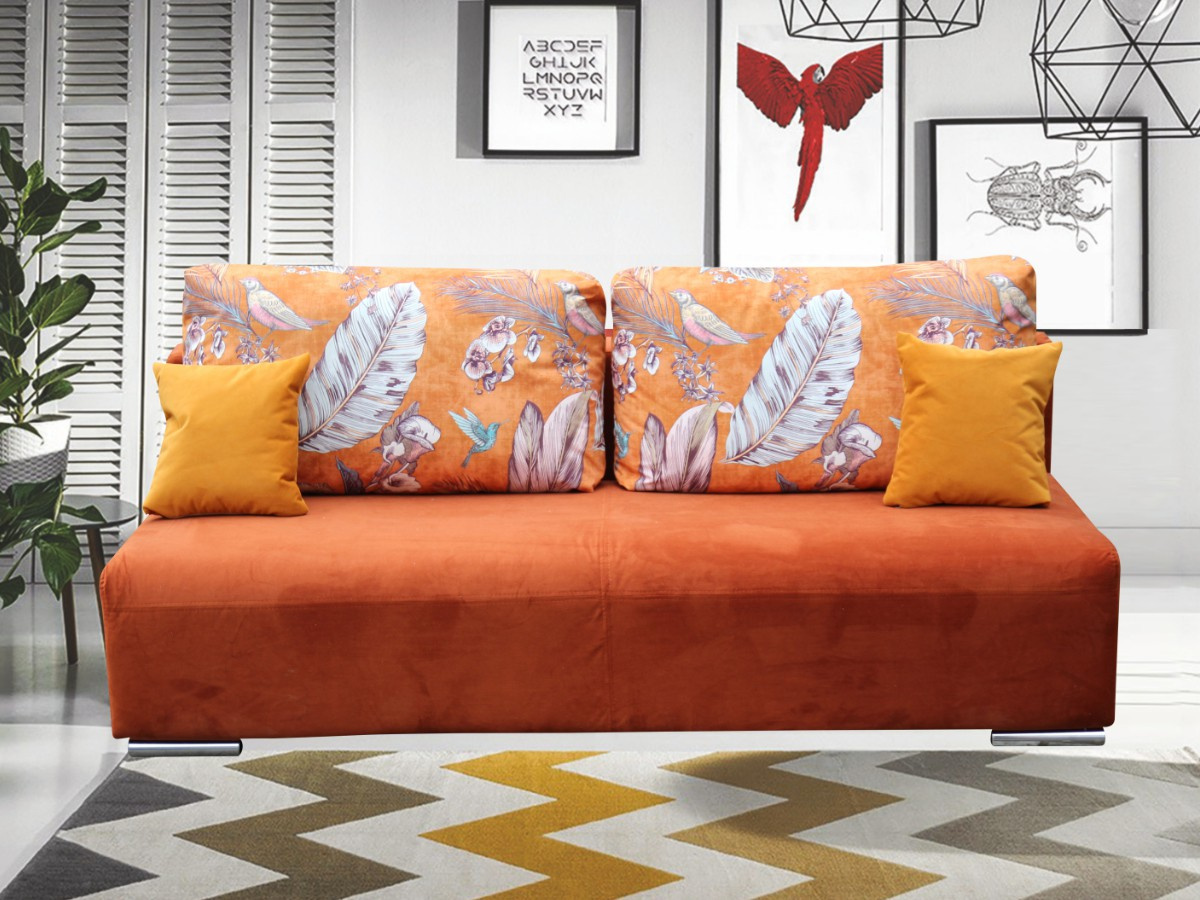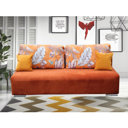 Rozkládací pohovka BENNY je očalouněna příjemnou potahovou látkou Teraccota / oranžovobílé listy. Pohodlí při odpočinku zajišťuje výplň v sedáku - PUR pěna, bonell pružina. Pohovka má praktický úložný prostor, ozdobné polštáře. Pohovka je rozkládací, přičemž je vhodná na denní spaní. Funkce jednoduchého rozkladu v automatu. Spací plocha je 135 x 190 cm.