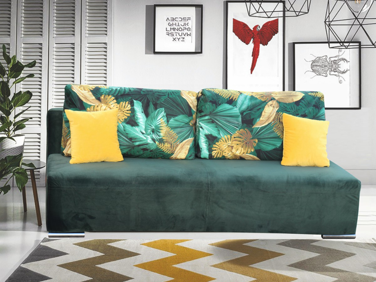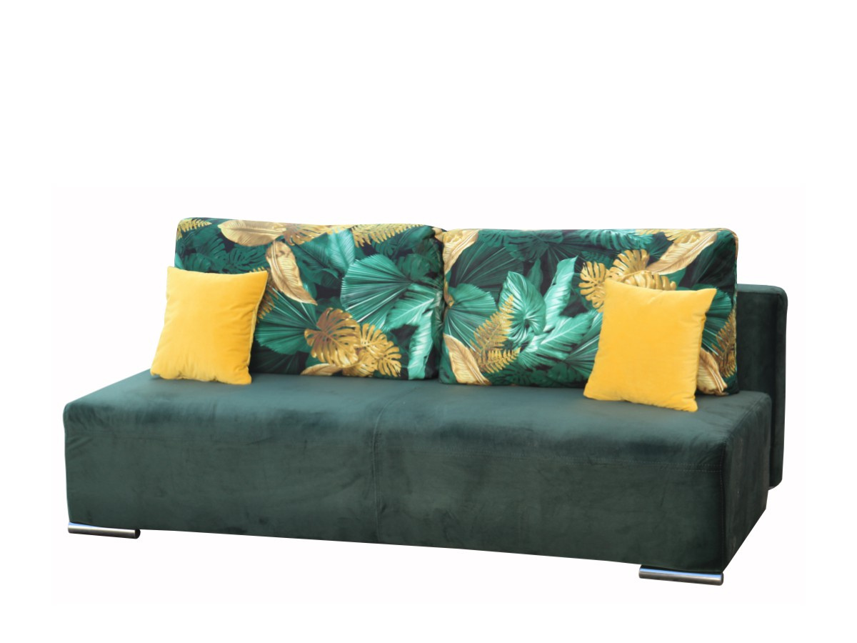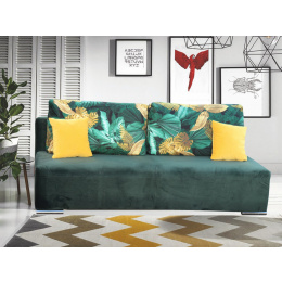 Rozkládací pohovka BENNY je očalouněna příjemnou potahovou látkou tm. zelenou / zelenožluté listy. Pohodlí při odpočinku zajišťuje výplň v sedáku - PUR pěna, bonell pružina. Pohovka má praktický úložný prostor, ozdobné polštáře. Pohovka je rozkládací, přičemž je vhodná na denní spaní. Funkce jednoduchého rozkladu v automatu. Spací plocha je 135 x 190 cm.
