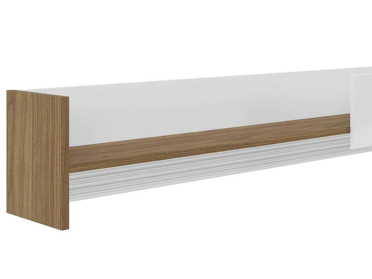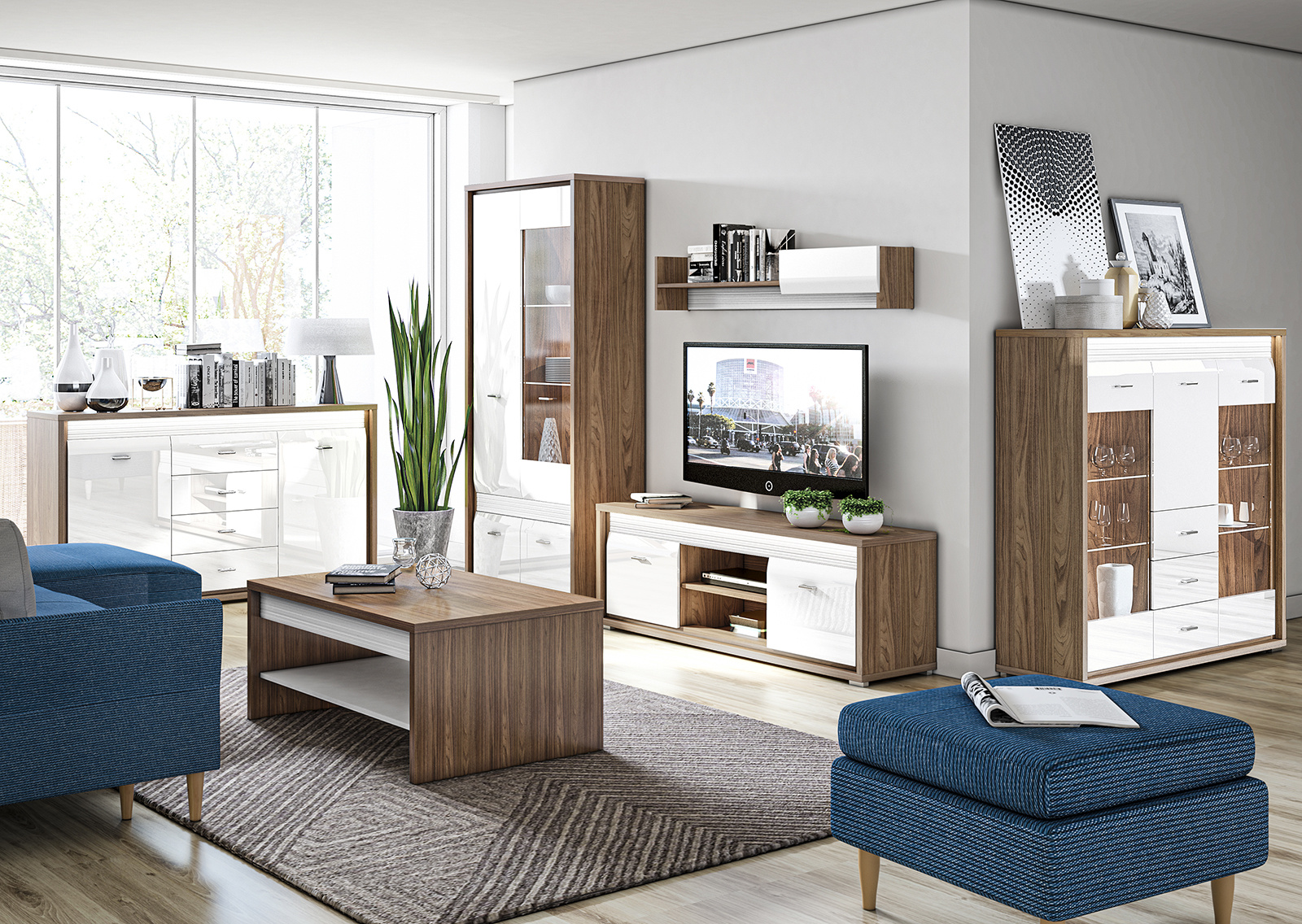 Luxusní systémový nábytek Dallas má pečlivě vybraný dekor přírodního ořechu s čelními plochami v bílém lesku, které přinášejí eleganci a svěžest do Vašeho bytu. Nábytkový systém Dallas je charakteristický horním zaoblením dvířek v MDF folii, které svým tvarem zdůrazňují jeho jedinečnost. Dalším atraktivním detailem je rýhovaná lišta horní lišta, která si můžete vybrat ve dvou odstínech - bílá nebo ořech, která je u komod a televizních stolků, s LED nasvícením. Celkový exkluzivní dojem je doplněn kovovými úchyty. Volbou nábytku DALLAS dodáte Svému interiéru eleganci a exkluzivitu.