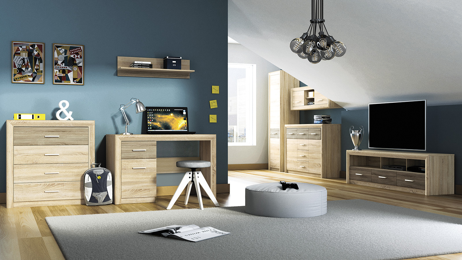 Sektorový nábytek CASTEL je v barevném provedení: dub sonoma světlý ( korpus a čelní plochy ) + MDF dub truflowý ( dekorativní lišta )