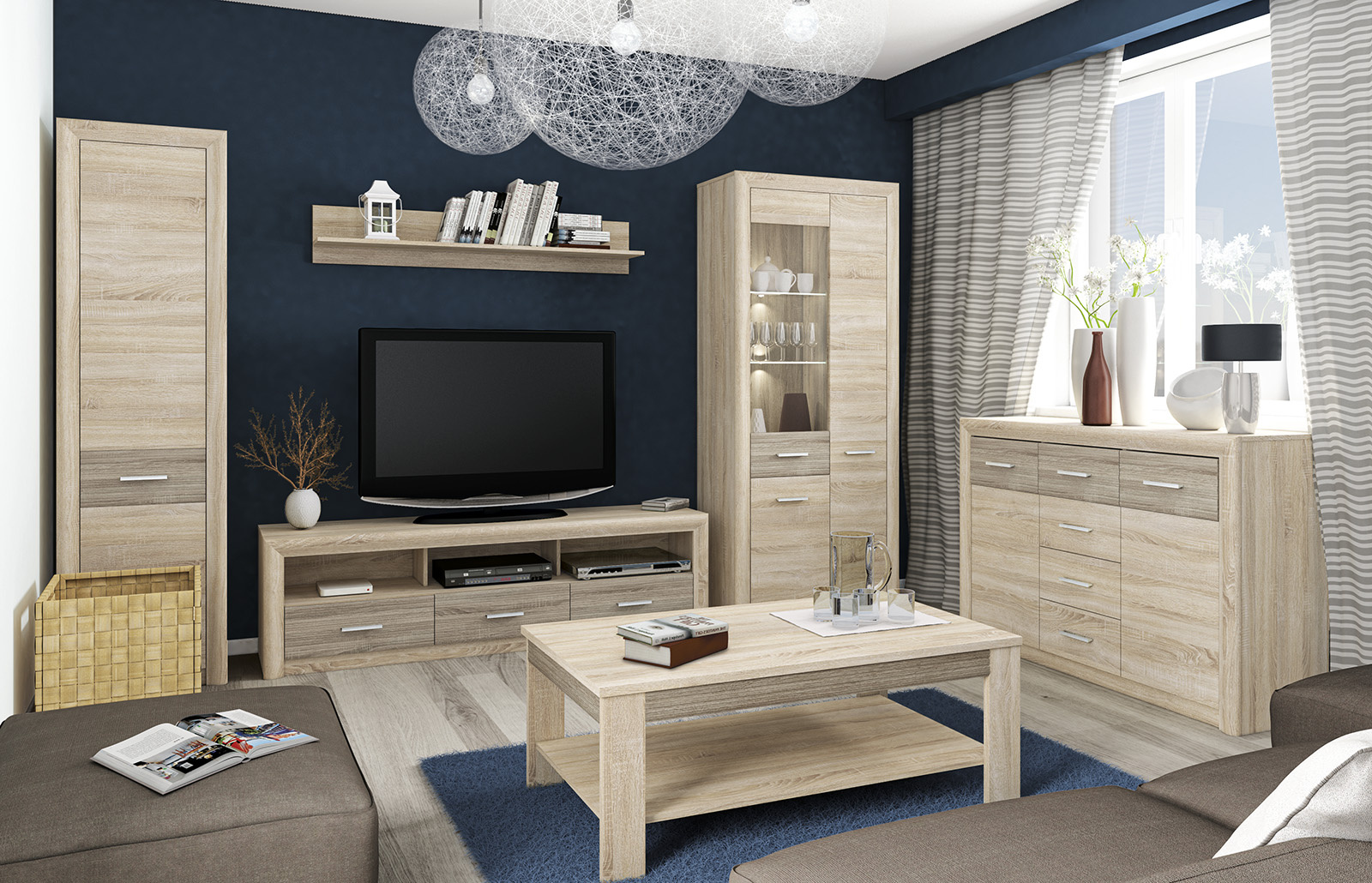 CASTEL je systémový nábytek vyrobený z kvalitního lamina v přírodním dekoru dub sonoma světlá, v kombinaci s drážkovanou lištou z MDF v barvě dub truflowý. Široké a zaoblené MDF rámečky okolo korpusu zdůrazňují spolehlivost a současnou jemnost jednotlivých dílu nábytku CASTEL, která zatraktivní každý domácí interiér. LED osvětlení vitrín a úchyty v barvě šampaň, podtrhují jeho vytříbený charakter a eleganci. Sektorový nábytek CASTEL je ideální pro vybavení obývacího pokoje. Zároveň se hodí i pro zařízení studentských nebo dětských pokojů.