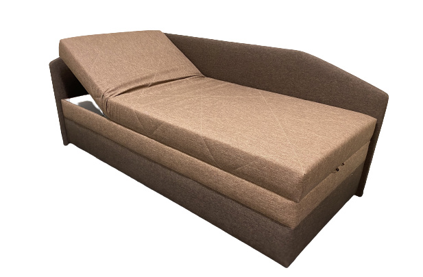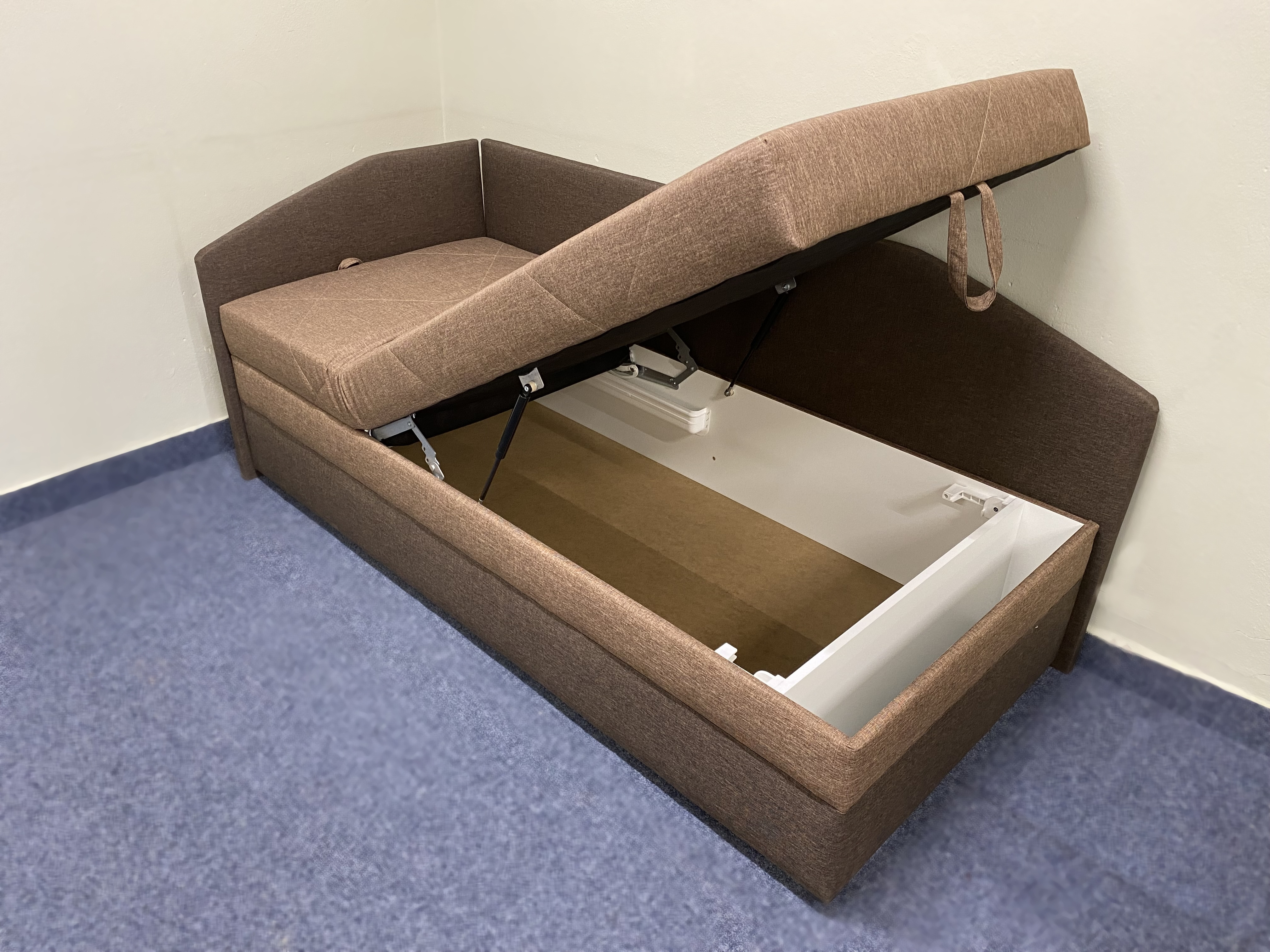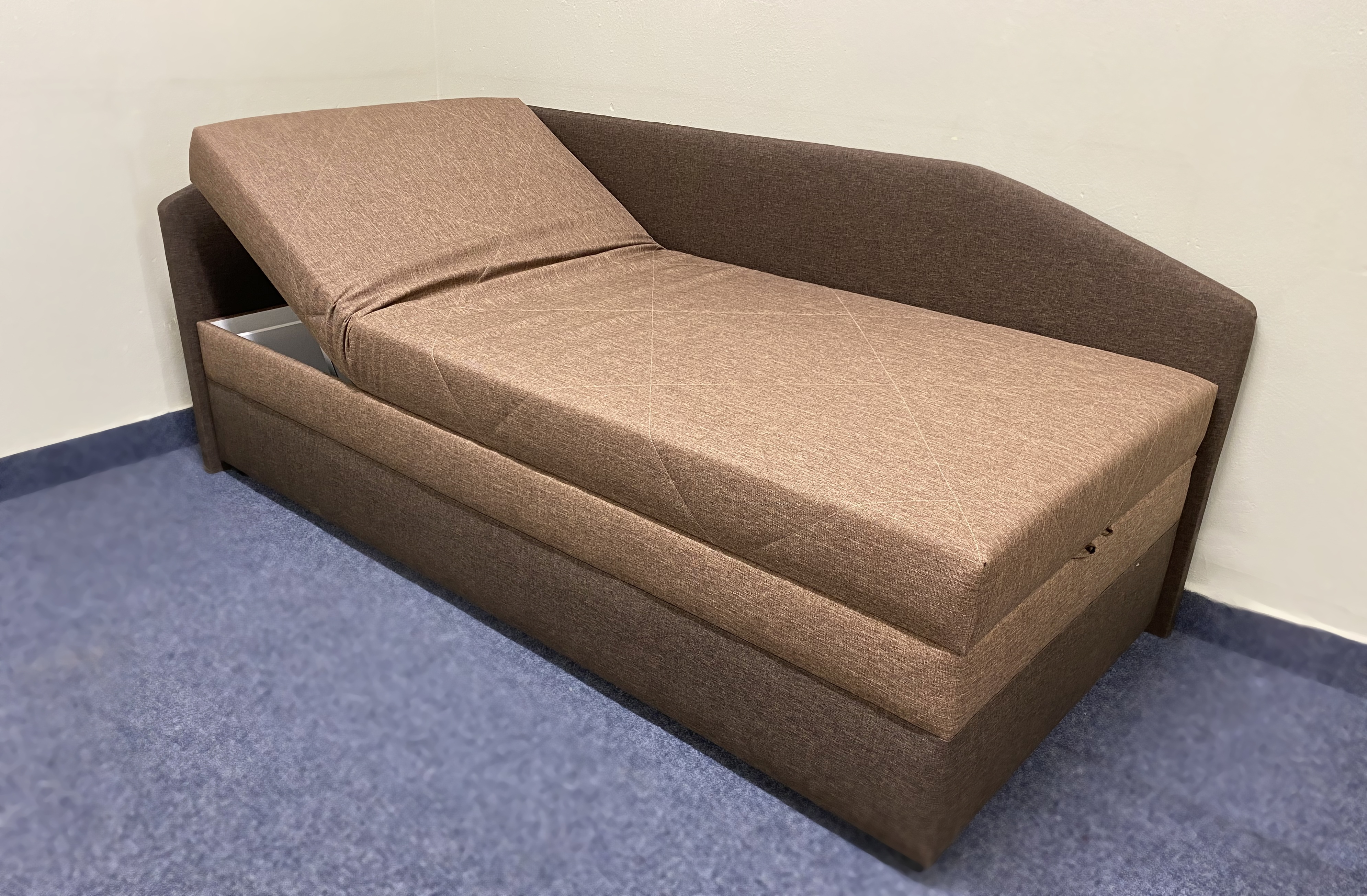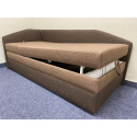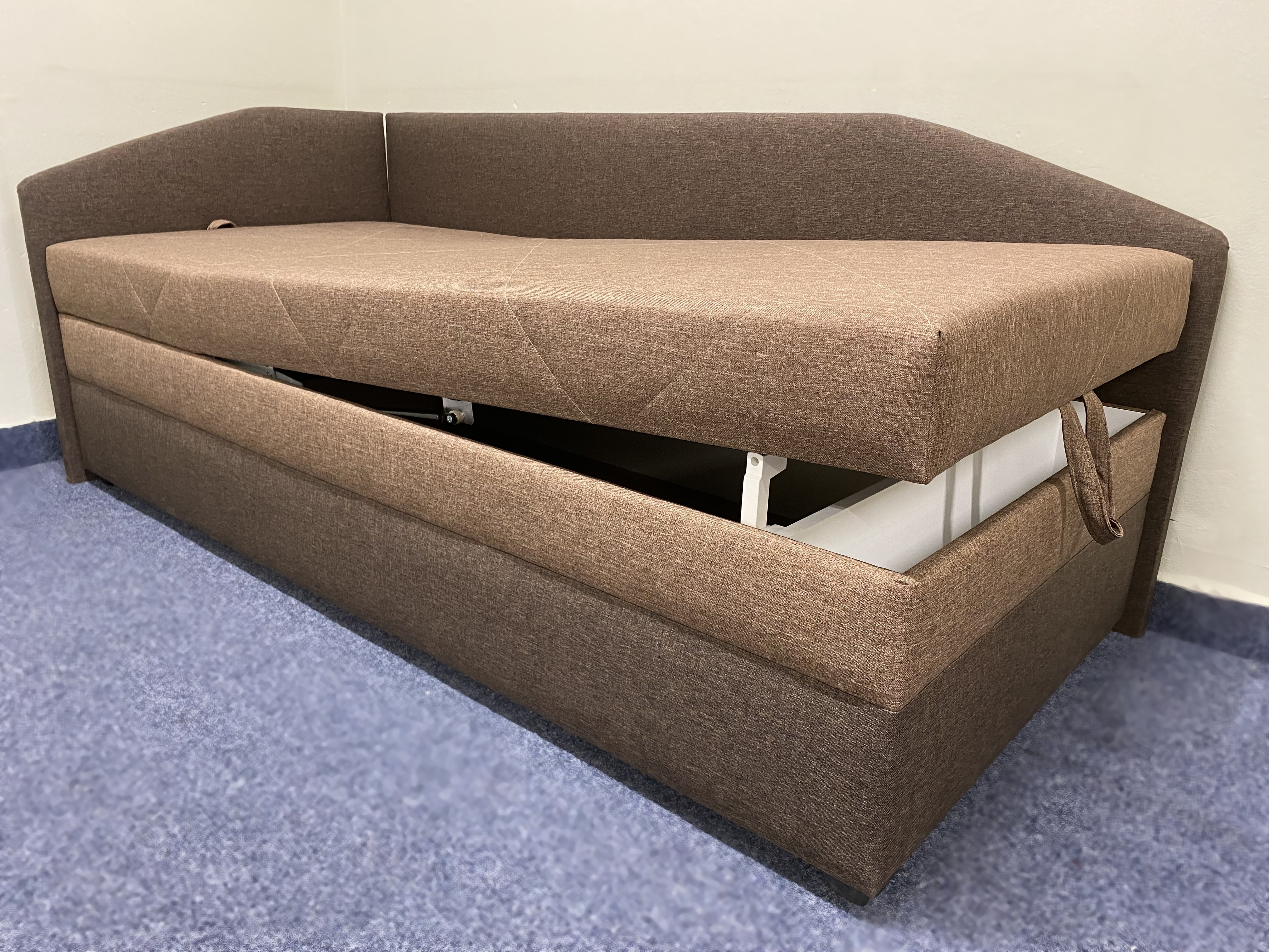 Moderní rohová válenda se dvěma čely a s elastickou PUR matrací, uloženou na polohovacím lamelovém roštu (polohování hlava + nohy), úložný prostor přístupný od nohou. Čela nejsou očalouněná ze zadní strany.