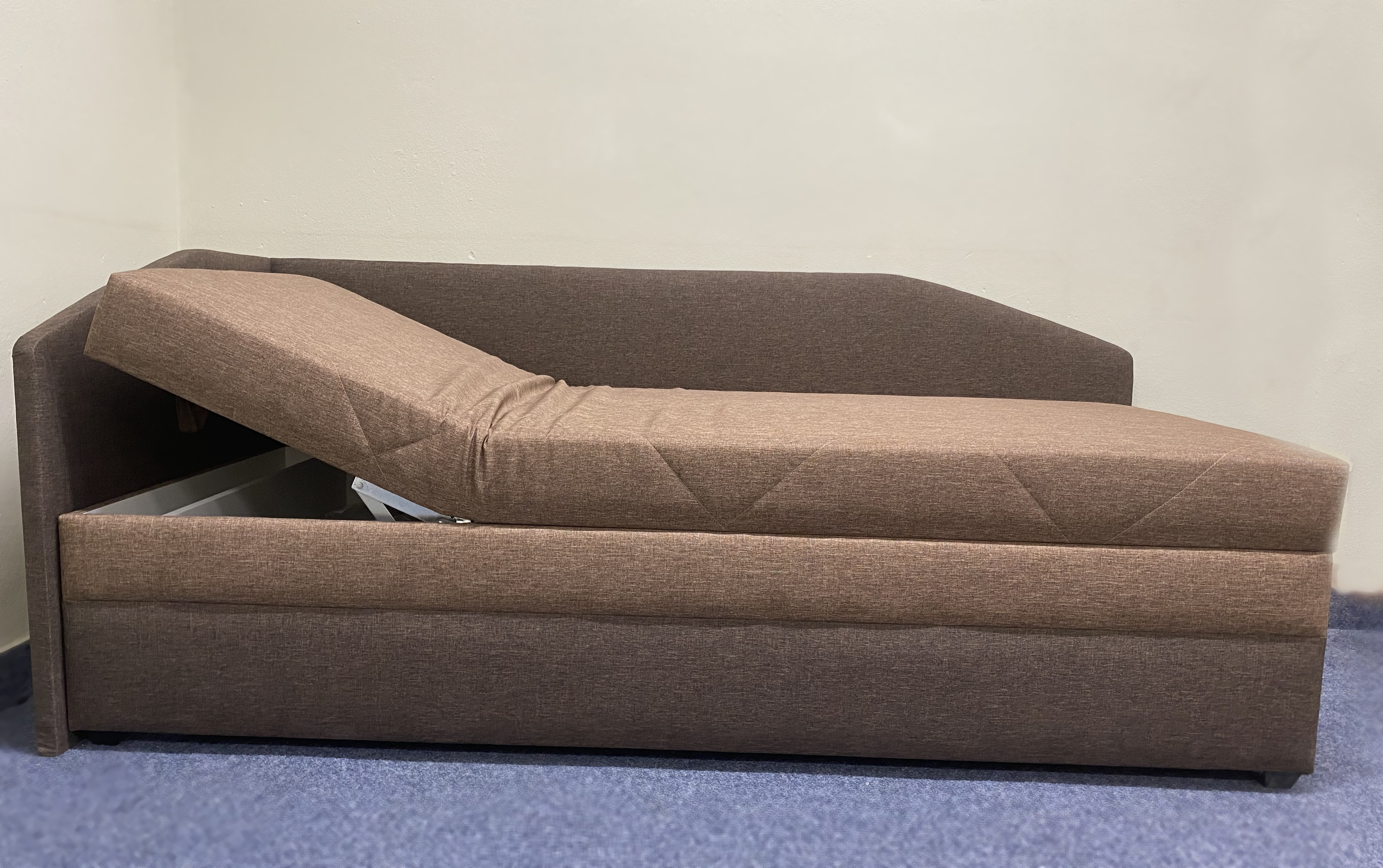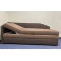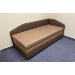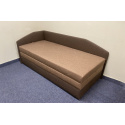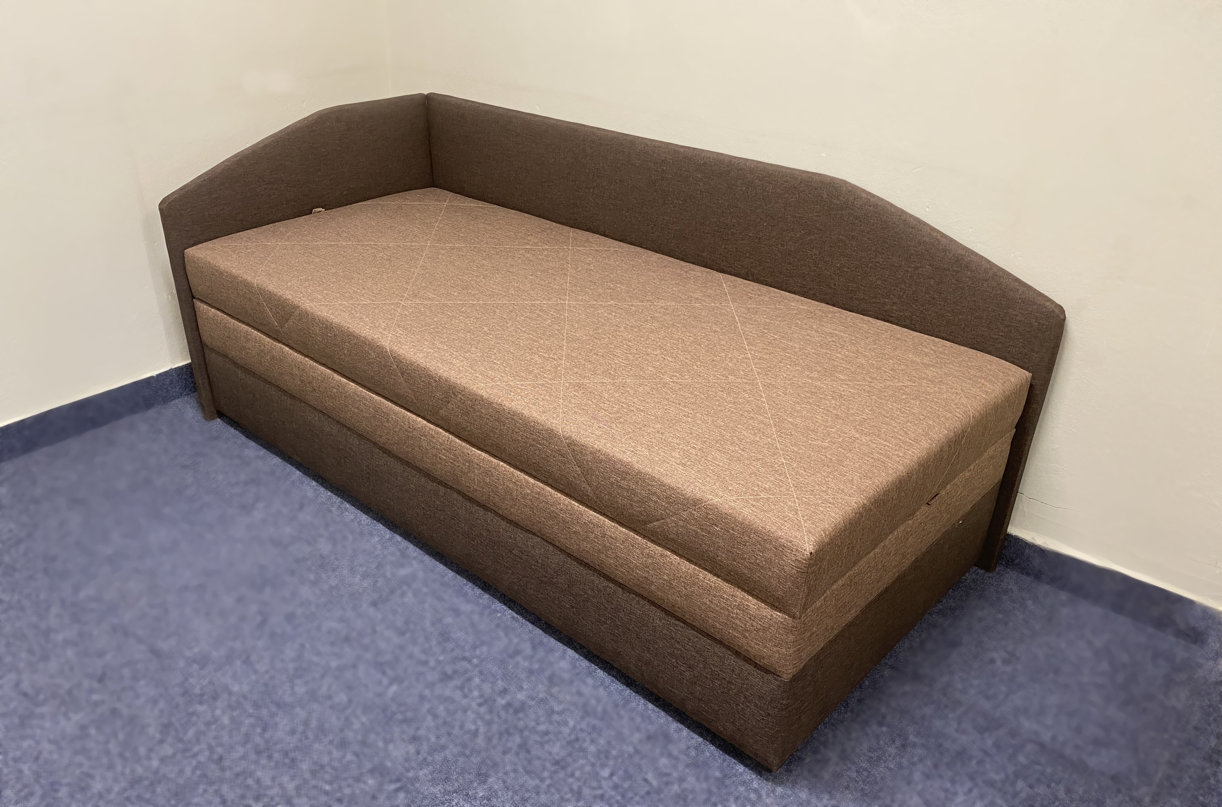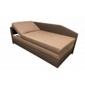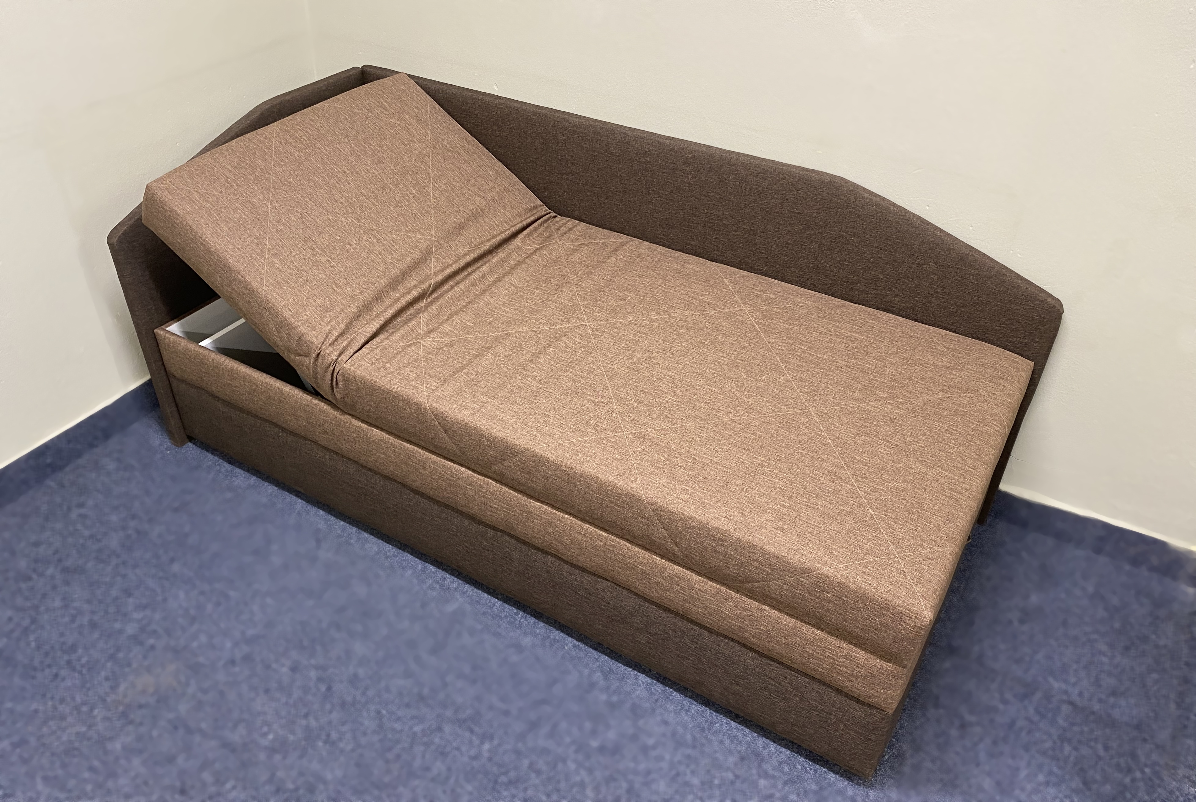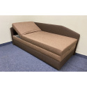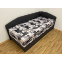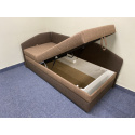 Moderní rohová válenda se dvěma čely a s elastickou PUR matrací, uloženou na polohovacím lamelovém roštu (polohování hlava + nohy), úložný prostor přístupný od nohou. Čela nejsou očalouněná ze zadní strany.