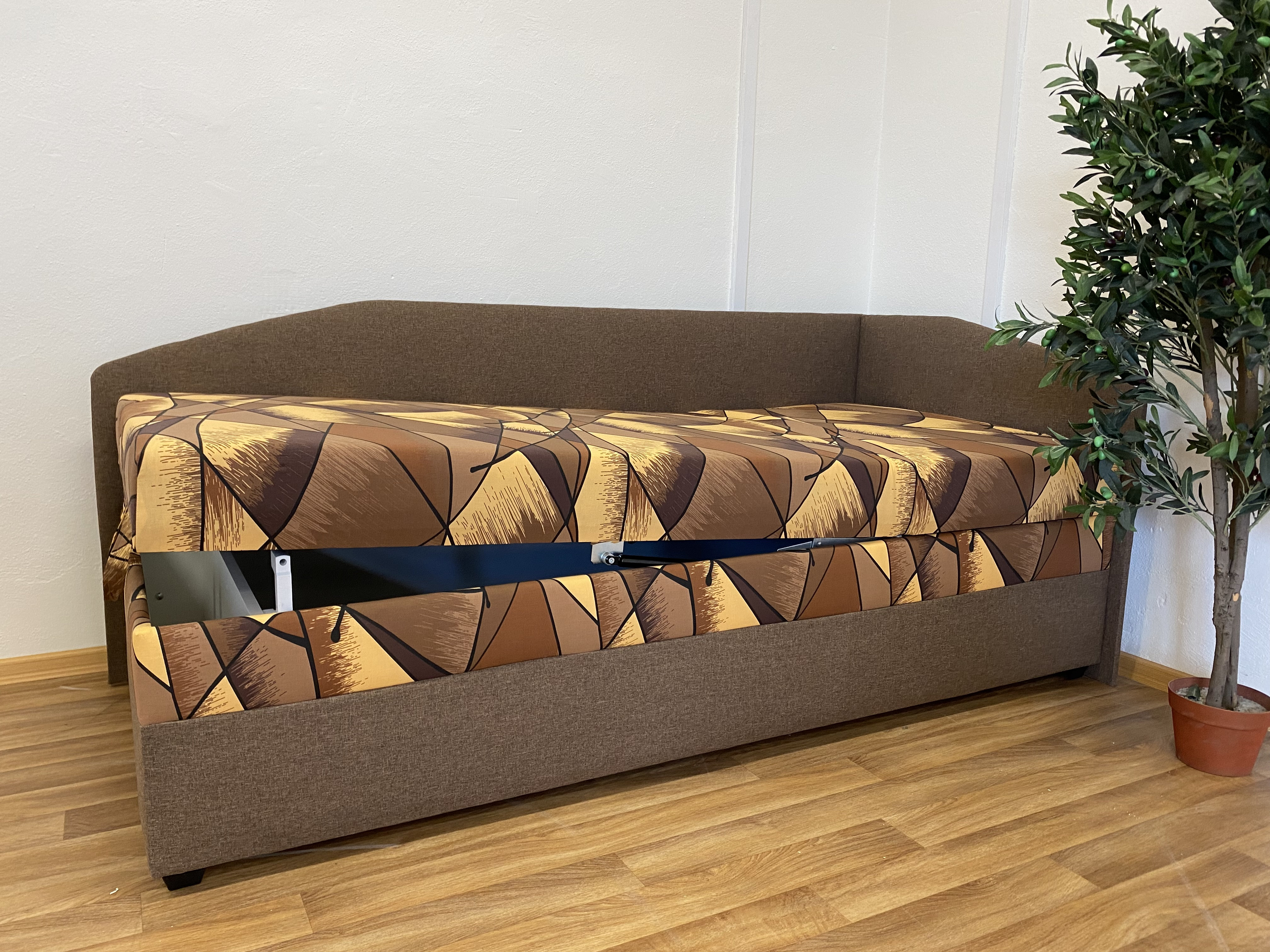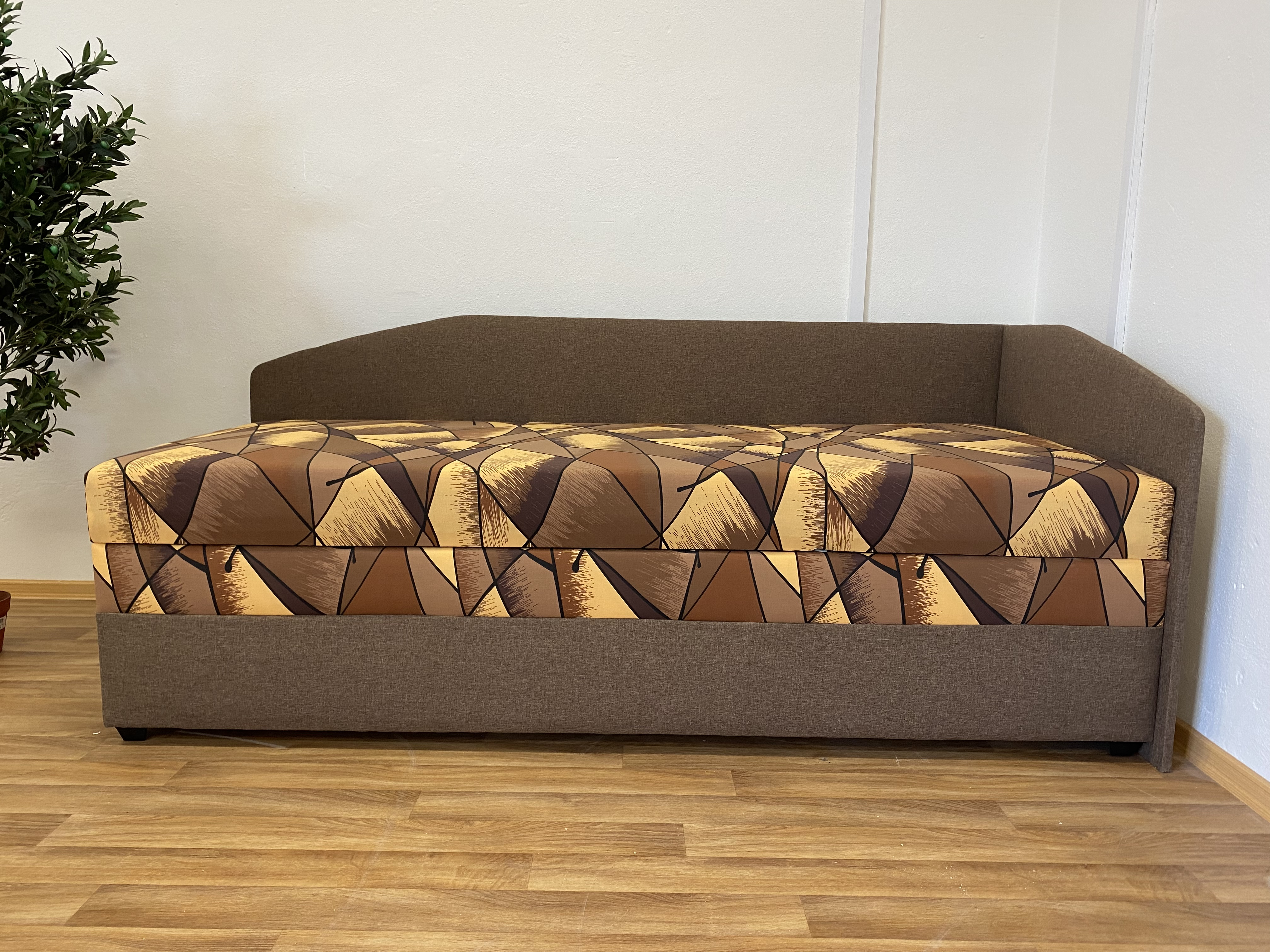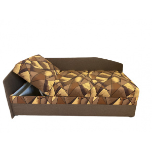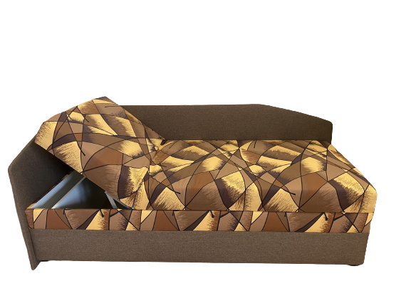 Moderní rohová válenda se dvěma čely a s elastickou PUR matrací, uloženou na polohovacím lamelovém roštu (polohování hlava + nohy), úložný prostor přístupný od nohou. Čela nejsou očalouněná ze zadní strany.