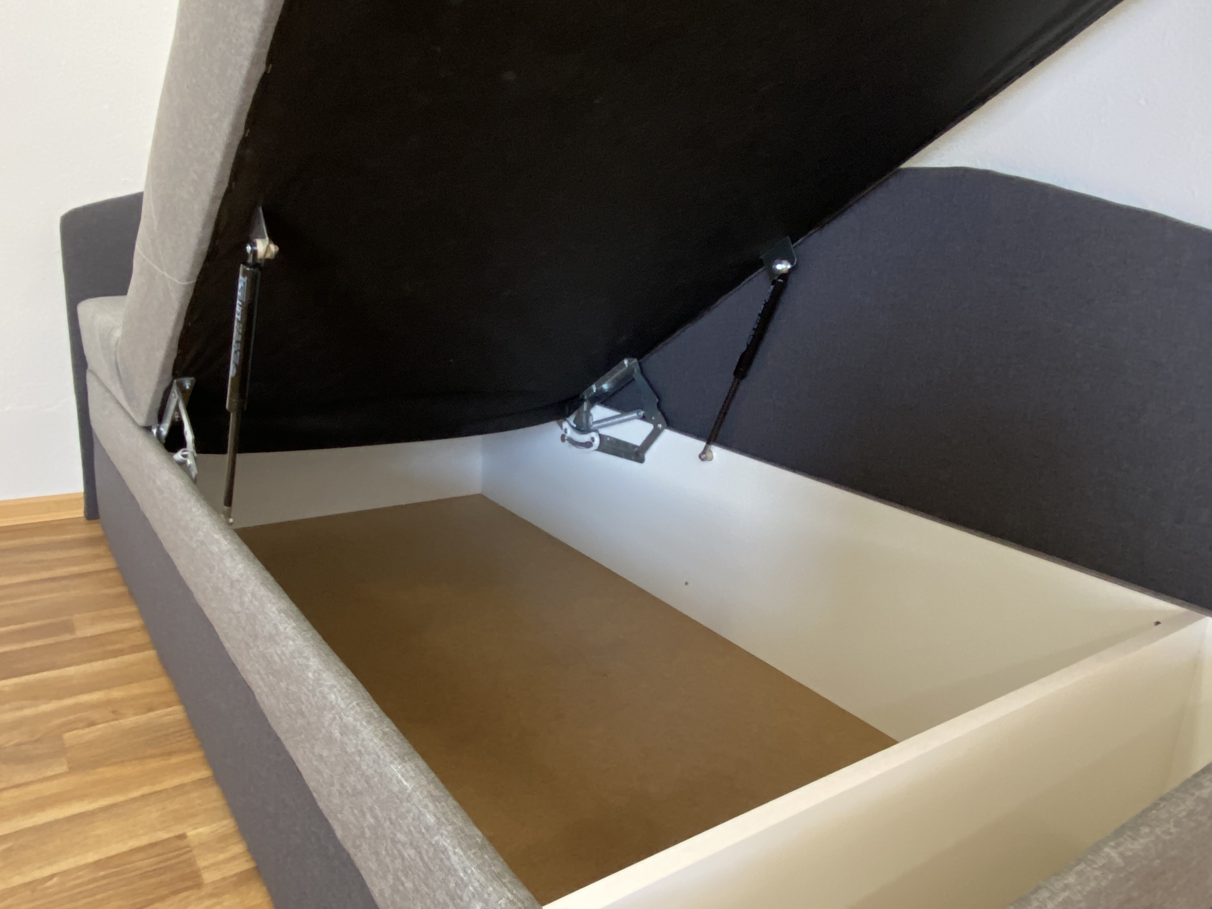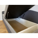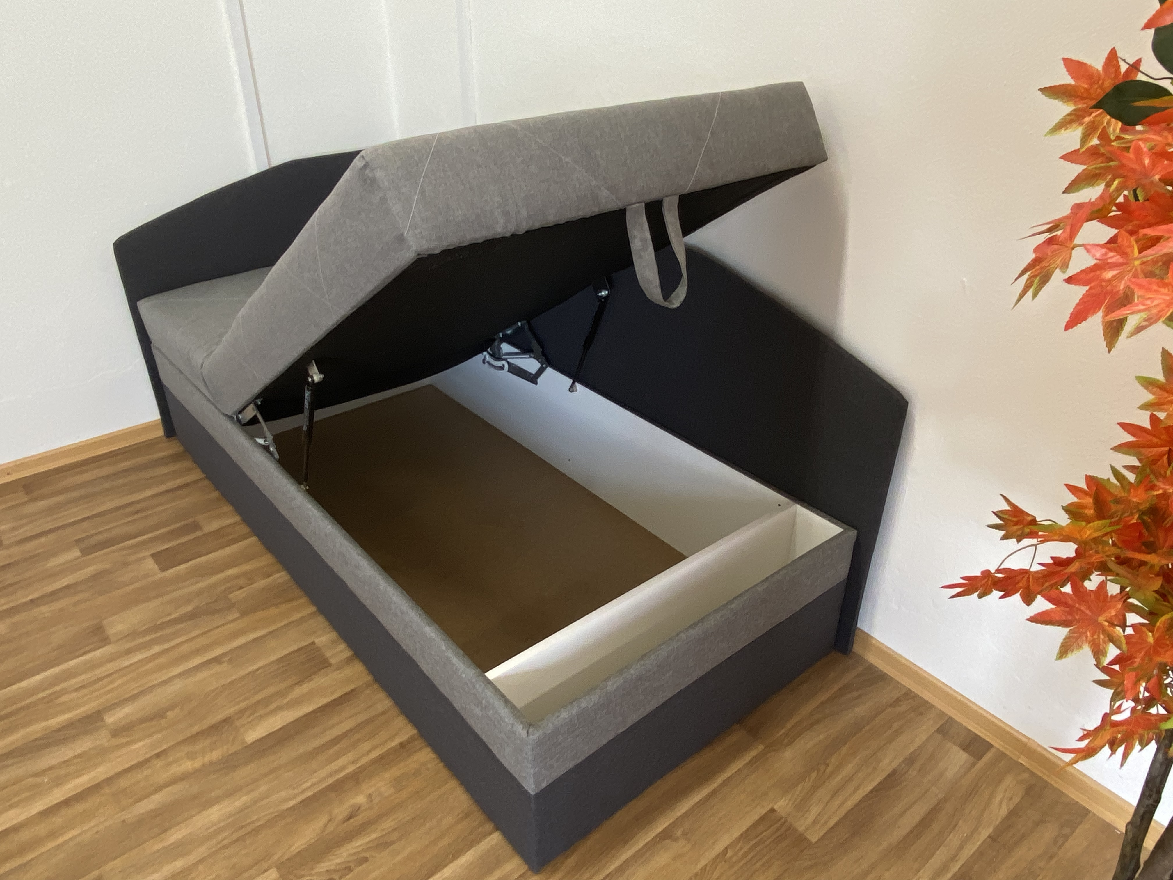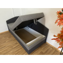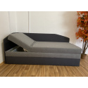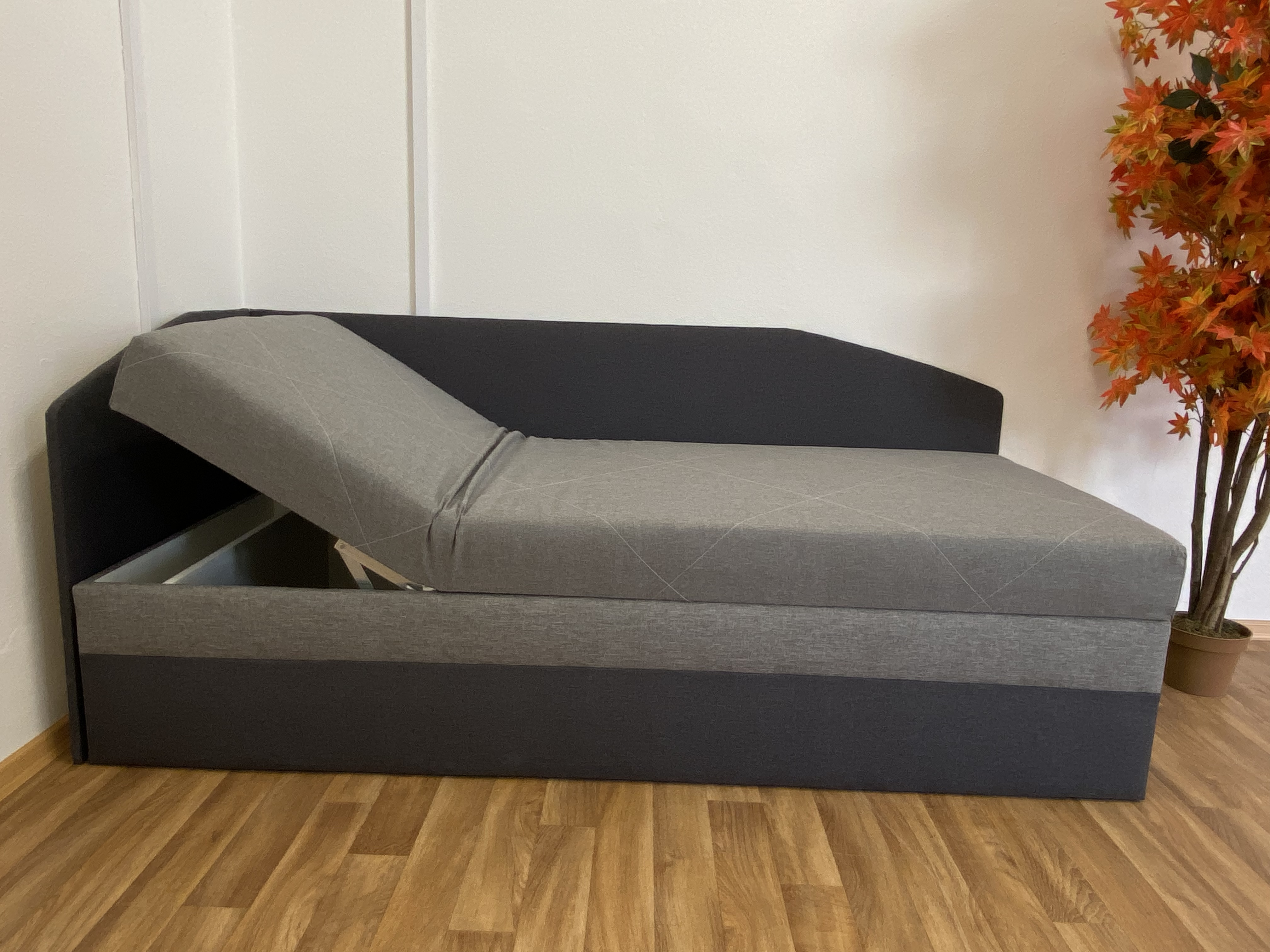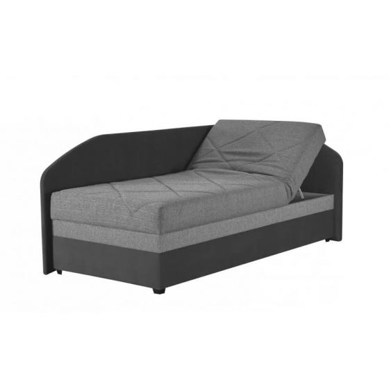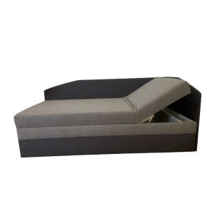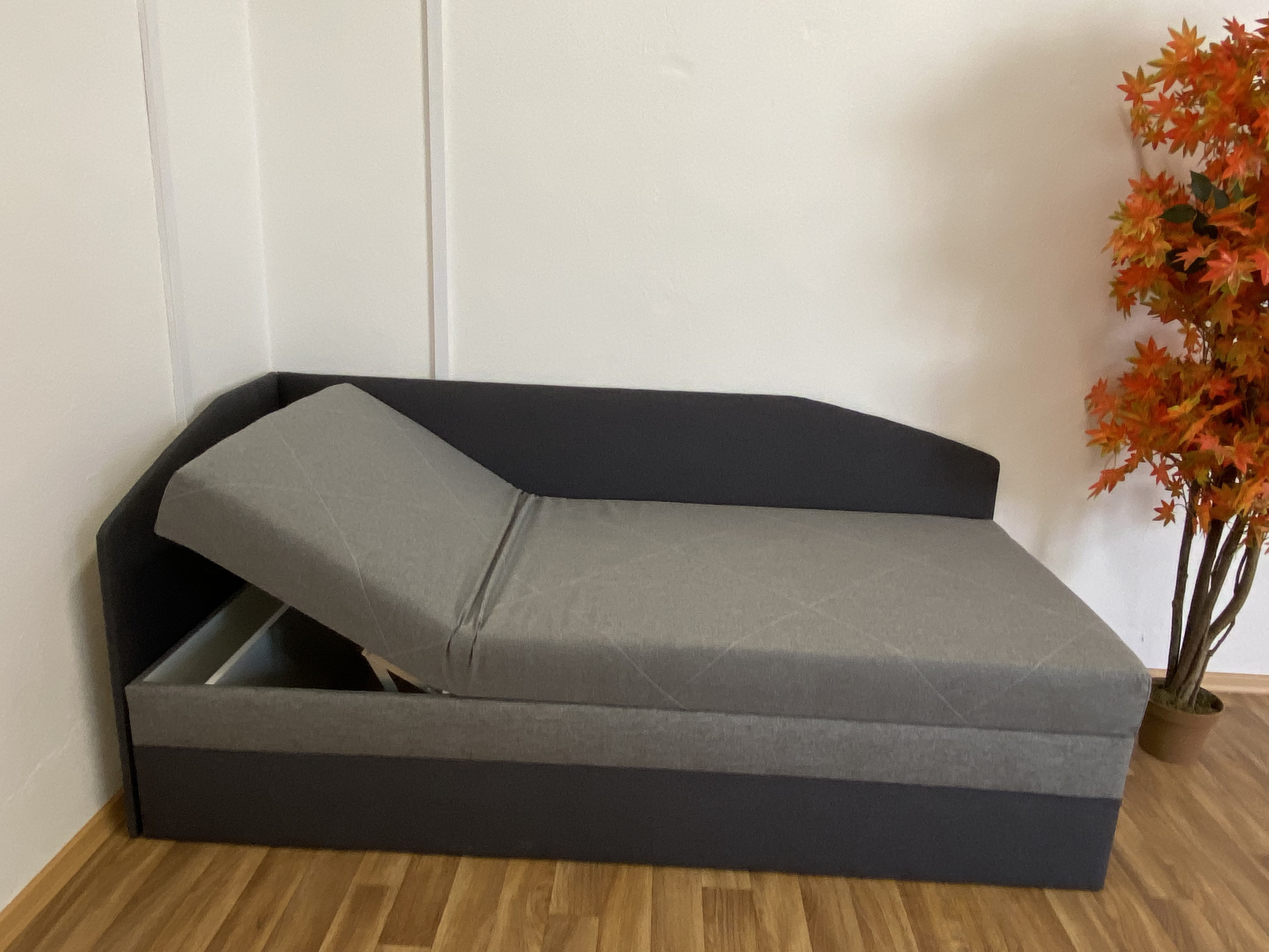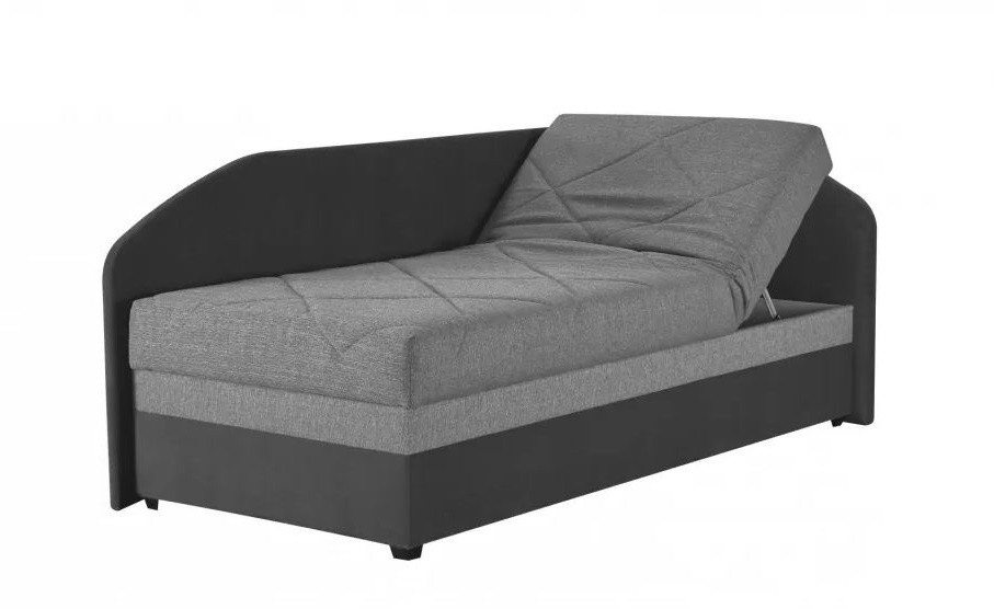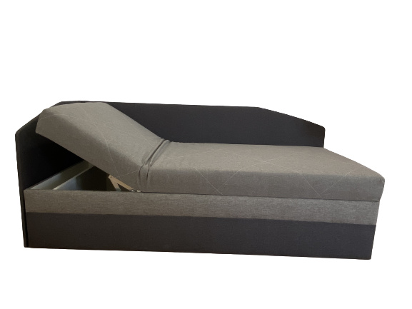 Moderní rohová válenda se dvěma čely a s elastickou PUR matrací, uloženou na polohovacím lamelovém roštu (polohování hlava + nohy), úložný prostor přístupný od nohou. Čela nejsou očalouněná ze zadní strany.