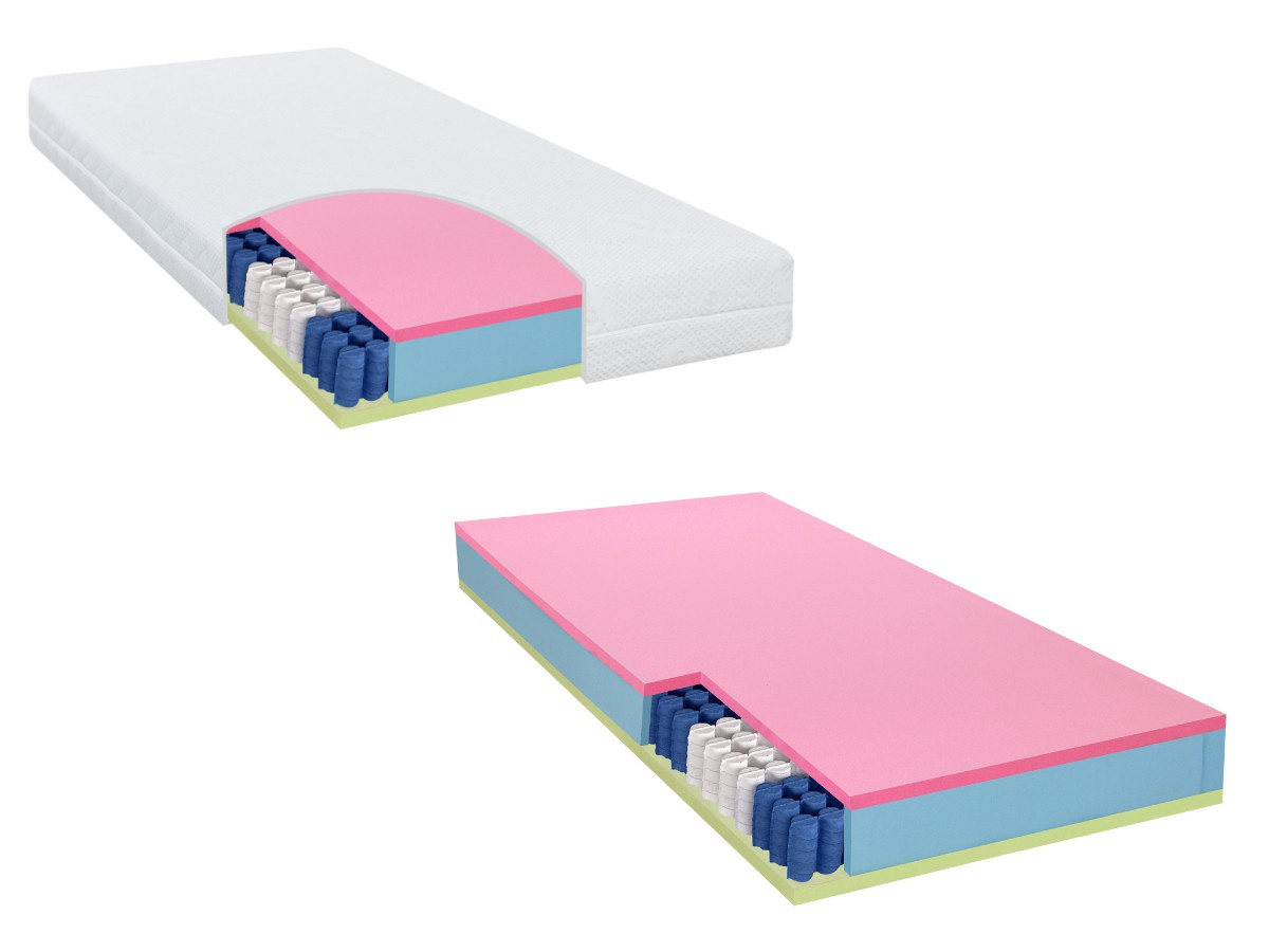 Matrace: oboustranná ortopedická matrace se 7 zónami. Taštičkové jádro, pokryté z obou stran PUR pěnou. Taštičkové matrace můžete umístit na nepolohovatelný lamelový rošt, pevný rošt nebo na pevnou plnou desku. Rošt nesmí mít mezi latěmi větší mezery jak 5 cm a nedoporučuje se umístit tuto matraci ani na polohovací rošt.