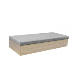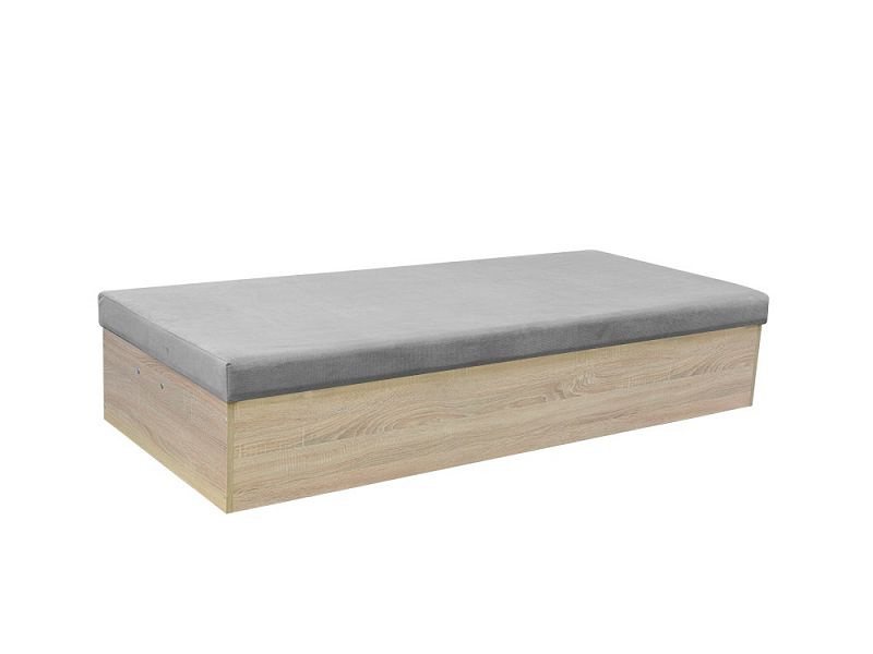Moderní válenda BRONA je vhodná na chaty, chalupy i do dětského pokoje. Korpus postele je z lamina v dekoru dub sonoma. Spací plocha matrace má látkový potah v šedé barvě. Válenda má pružinovou matraci s nosností 90 kg. Pod lehací plochou je úložný prostor pro uložení dek a lůžkovin