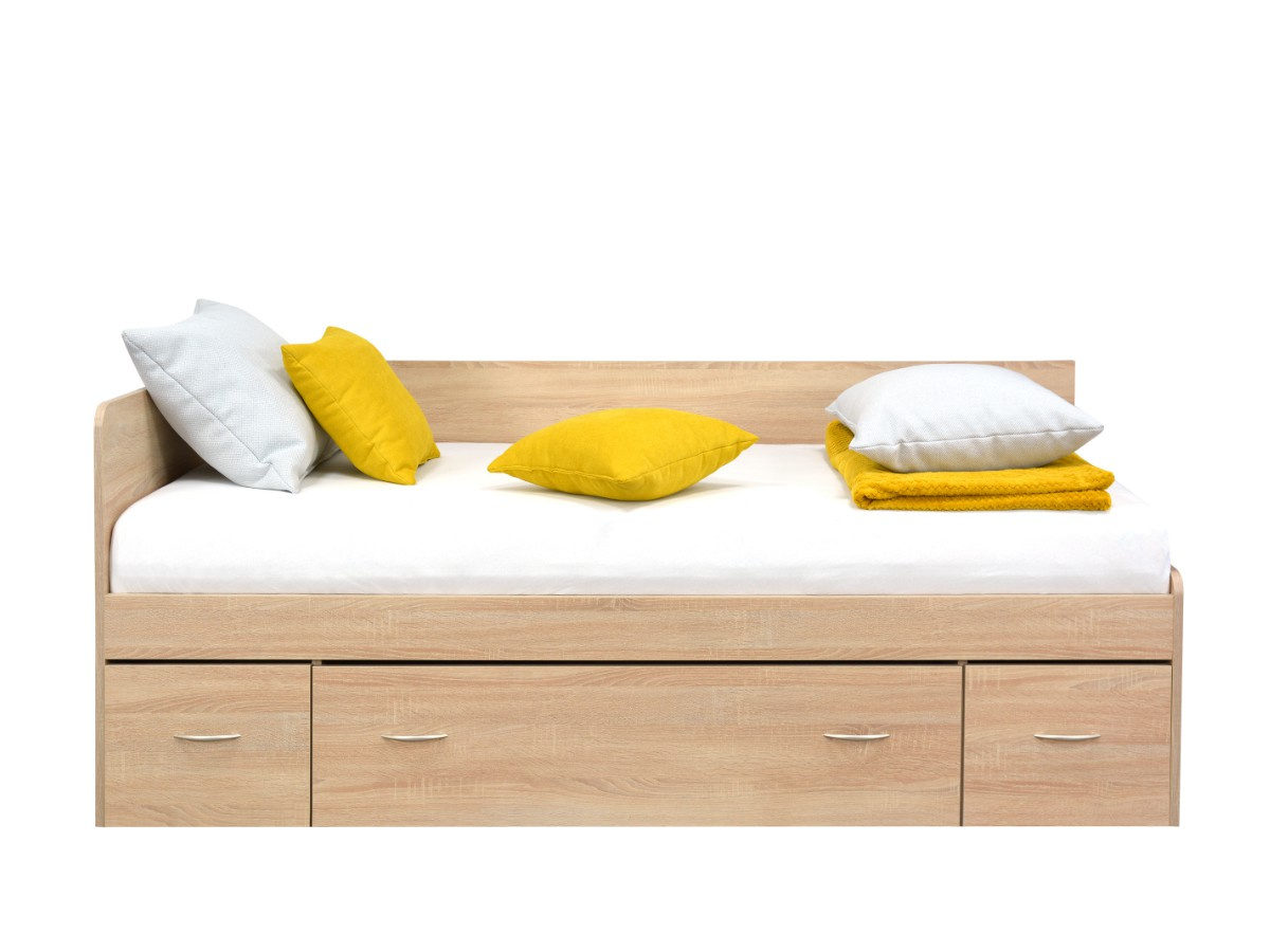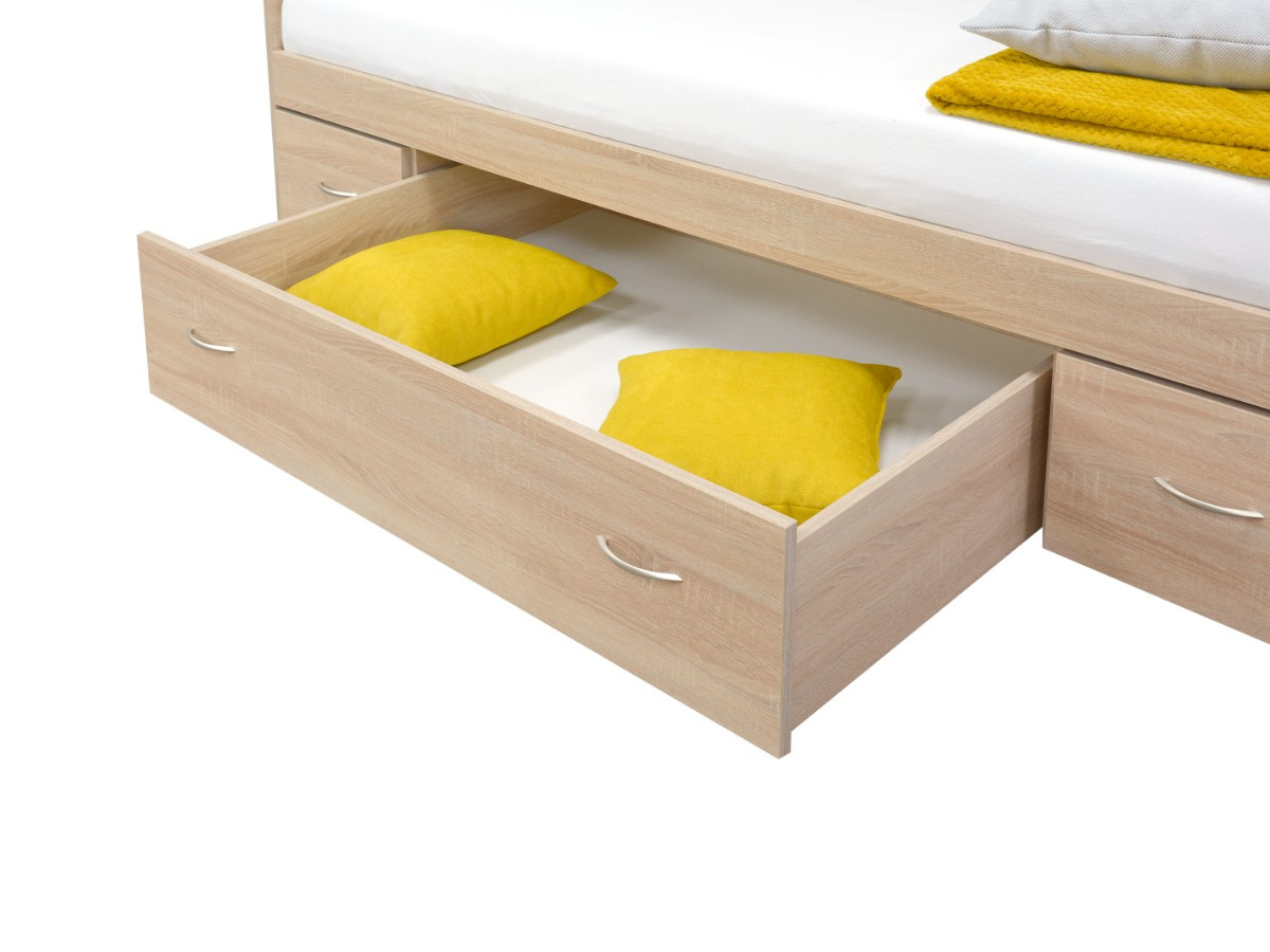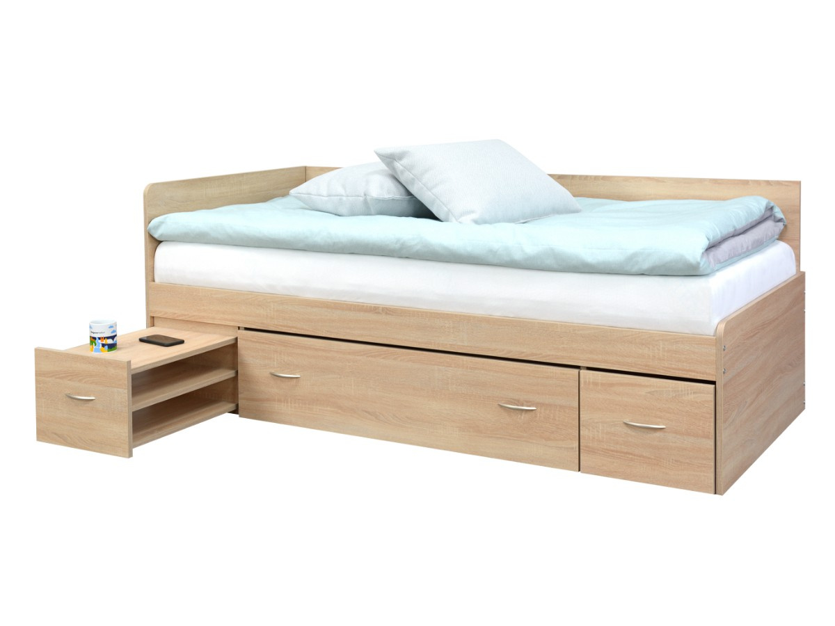 Postel ELVIRA, má po stranách zabudované noční stolky s poličkou, úložný prostor je uprostřed a pevný rošt je součástí postele. Čela u válendy ELVIRA jsou univerzální, můžete na pravou i levou stranu, podle dispozic pokoje. Levou nebo pravou variantu si zvolíte až při montáži. Válenda je vyrobená z kvalitního lamina v dekuru dub sonoma. Válenda je určená pro matraci o rozměru 90 × 200 cm. Matrace není součástí postele, můžete si ji vybrat v naší nabídce.