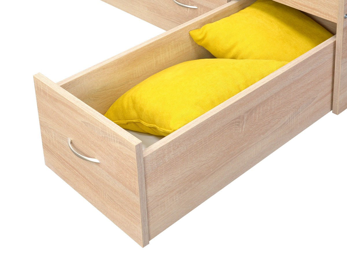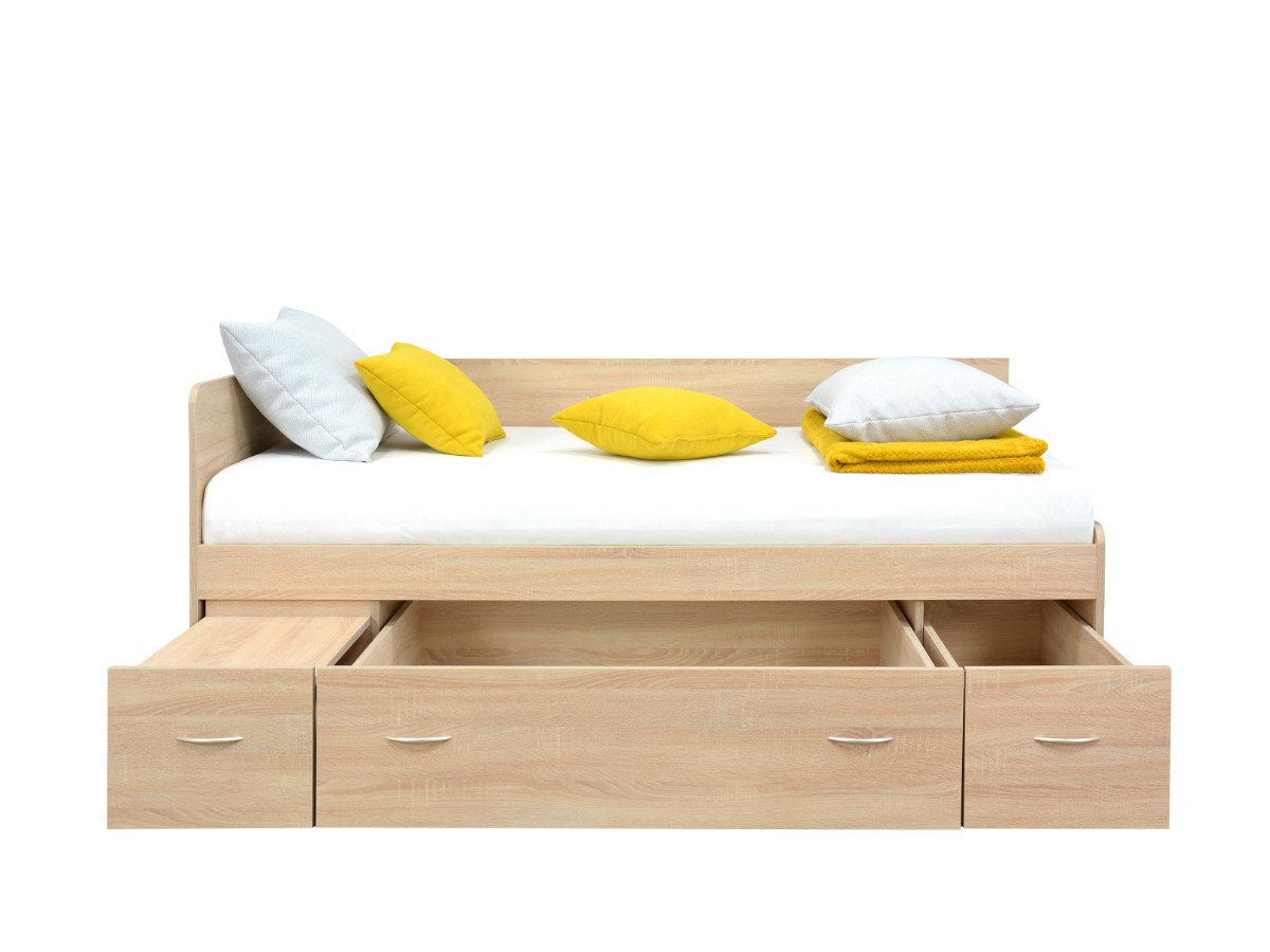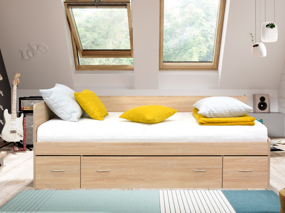 Postel ELVIRA, má po stranách zabudované noční stolky s poličkou, úložný prostor je uprostřed a pevný rošt je součástí postele. Čela u válendy ELVIRA jsou univerzální, můžete na pravou i levou stranu, podle dispozic pokoje. Levou nebo pravou variantu si zvolíte až při montáži. Válenda je vyrobená z kvalitního lamina v dekuru dub sonoma. Válenda je určená pro matraci o rozměru 90 × 200 cm. Matrace není součástí postele, můžete si ji vybrat v naší nabídce.