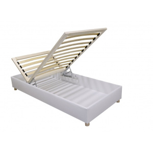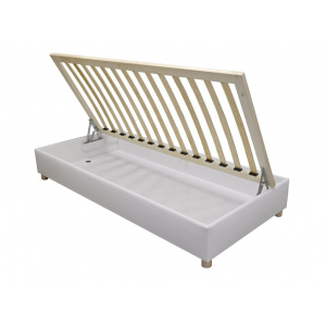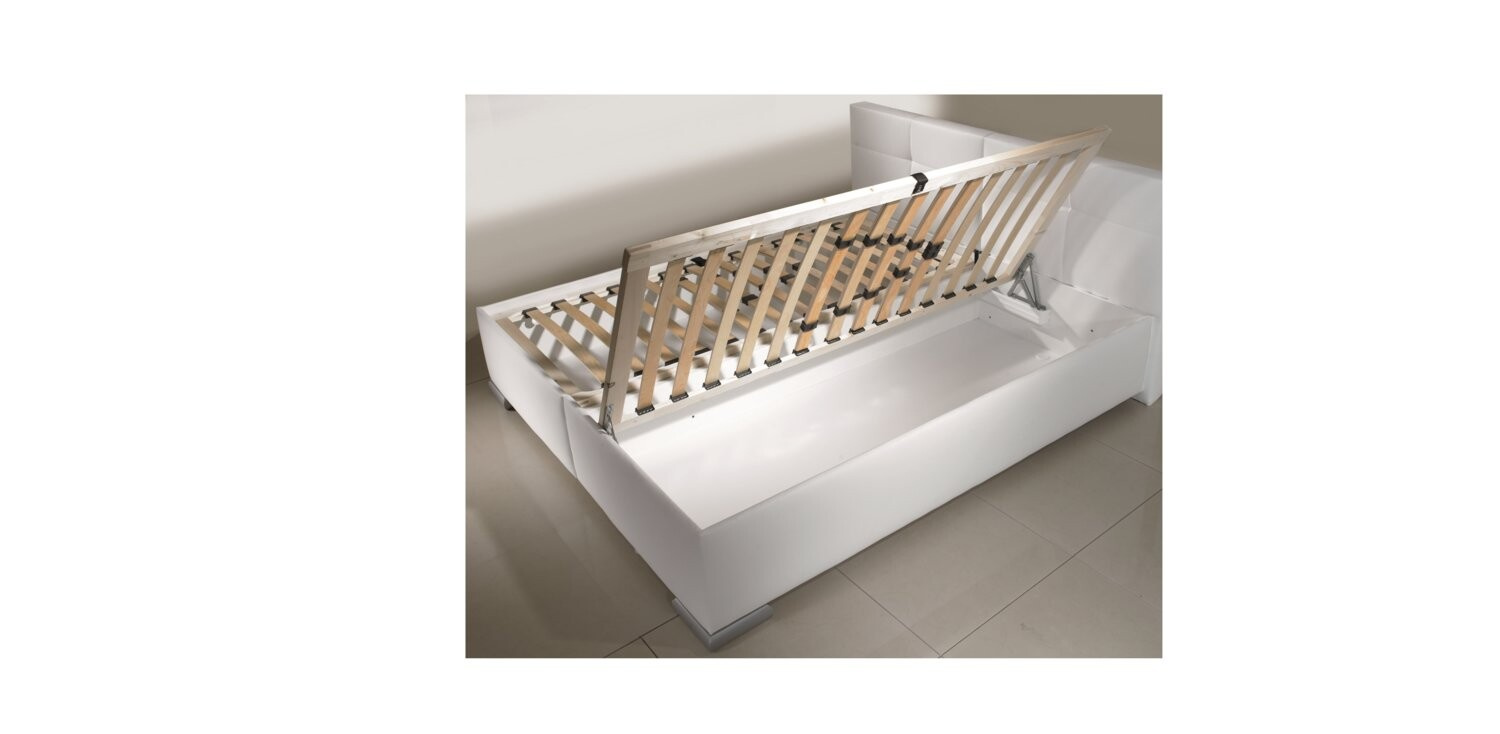 Čelo je zhotoveno z DTD 16 mm, tloušťka čela je opticky po obvodu rozšířená páskem šířka 8 cm, má zaoblené všechny 4 rohy. Velikost úložného prostoru pod rošty je: 77 (při šířce 160 cm) nebo 87 (pří šířce 180 cm) x 199 x 24 cm, materiál bočnic postele bílé lamino tloušťka 18 mm, dno je vyhotoveno z bílé MDF. Postel obsahuje lamelové smrkové rošty s nastavováním tuhosti, rošt je s úložným prostorem spojen pružinovým zvedacím mechanismem pro pohodlný přístup