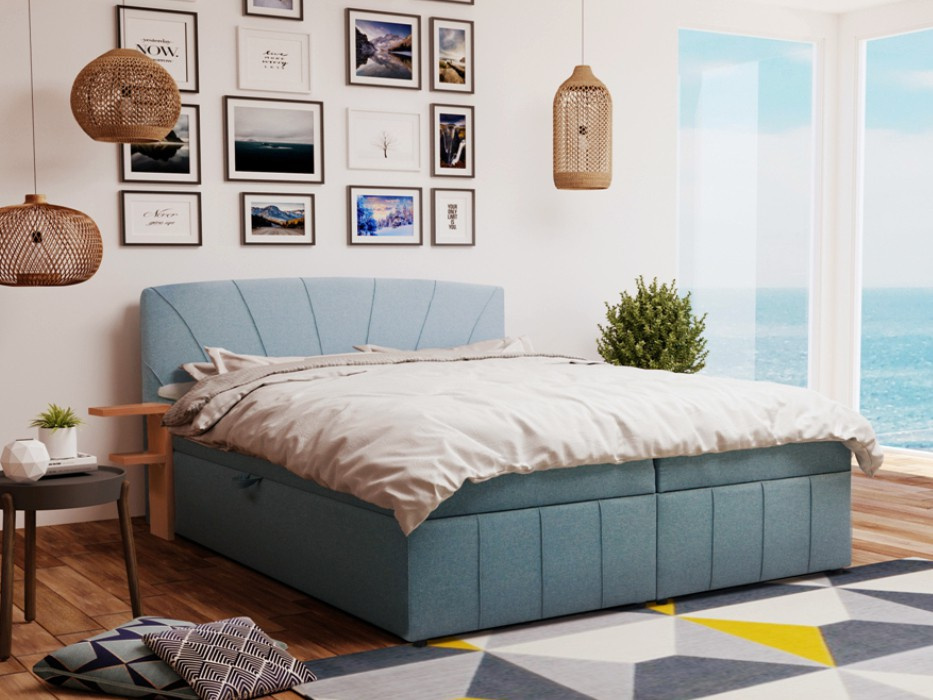 Boxspringová postel KAYLA je vyrobena v modrém (Cover 70) barevném provedení. Pohodlné prošívané čelo zajistí komfortní opírání. Lamelové rošty s výklopem - do postele jsou vsazeny dva lamelové rošty s bočním výklopem. Na nich je umístěna bonellová (pružinová) matrace. Součástí postele je veliký úložný prostor, do kterého je možné uschovat veškeré lůžkoviny, deky či jiné drobnosti. Součástí úložného prostoru je zabudované odvětrávání. Velikost spací plochy je 180 x 200 cm, výška sedu 60 cm včetně topperu