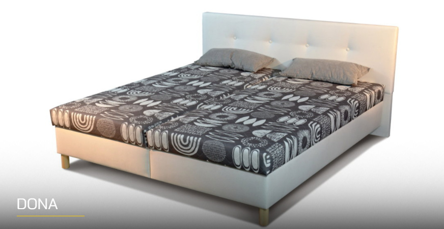 Postel Dona s matrací z PUR pěny nebo pružinovou matrací loženou na pevné desce a velkým úložným prostorem v bílém laminu s odvětrávacími otvory. Přístup do úložného prostoru je boku postele. Možnost volby roštu. Za příplatek lamelový rošt pevný s přístupem z boku postele nebo za příplatek možnost volby polohovacího lamelového roštu s přístupem do úložného prostoru od nohou. Lehací plocha postele 180 x 200 cm nebo 160x200cm. Možnost prošití povrchu postele za příplatek. Matrace zajišťuje dokonalý odpočinek a dobrou kvalitu spánku. Komfortní výška lehací plochy 44/50 cm dle volby nožek.