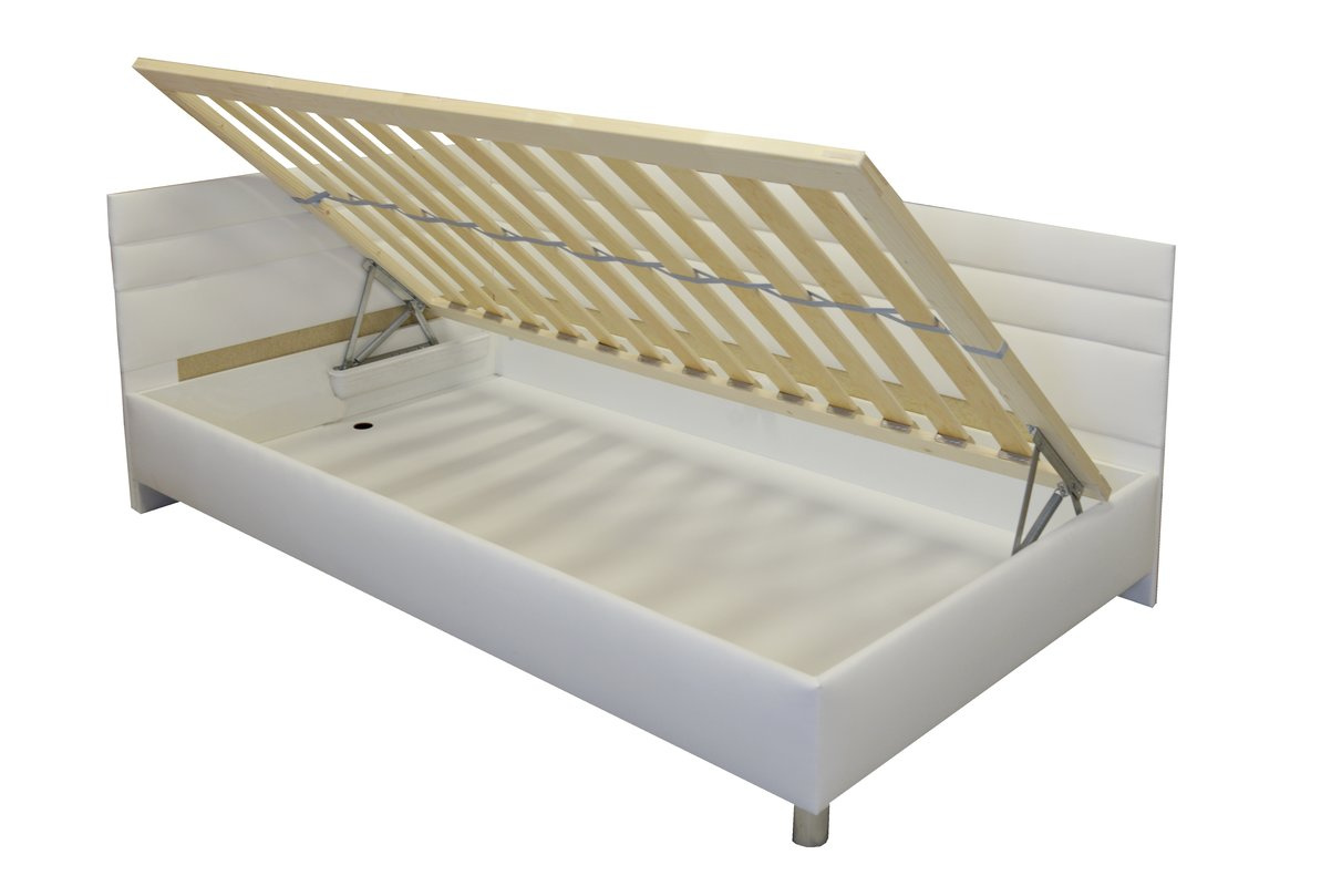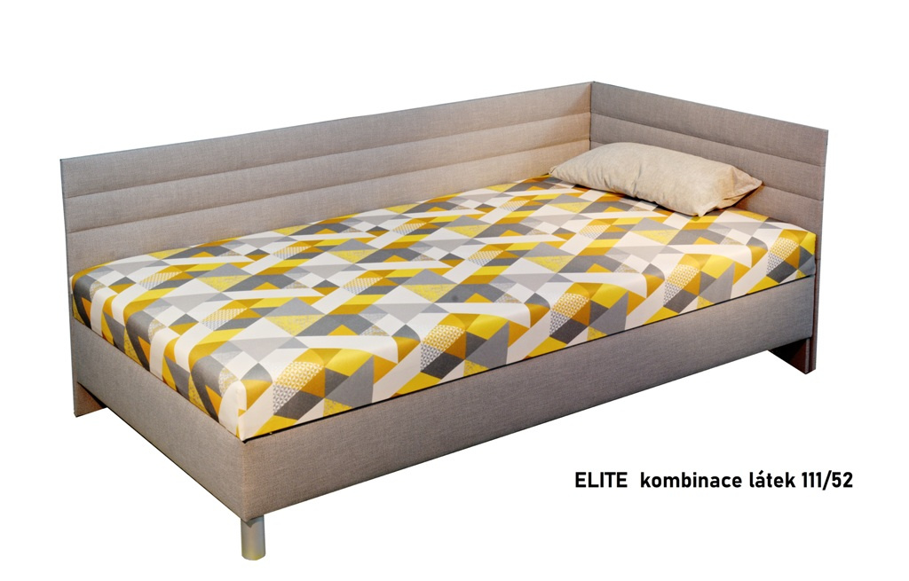 Moderní designová postel s čely do rohu - ELITE 140. S pevným lamelovým roštem, PUR matrací, velkým úložným prostorem v bílém laminu s odvětrávacími otvory. Přístup do úložného prostoru je z boku postele. Lehací plocha postele je 140 x 200 cm. Možno objednat i variantu lehací plochy 110 x 200 cm. Možnost volby levého a pravého provedení rohu. Matrace zajišťuje dokonalý odpočinek a dobrou kvalitu spánku. Možnost prošití povrchu postele za příplatek. Čela nejsou očalouněná ze zadní strany.