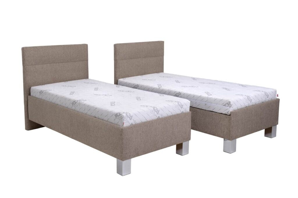 Dvoulůžko FABIO je očalouněná v látkách dle vašeho výběru. Postel má pohodlné čelo vysoké 112 cm. Výhodou této postele je možnost rozdělení na dvě samostatné postele. Výška sedu je 64 cm s matracemi (Royal max a Mona latex) z naší nabídky. Zvolit si můžete matraci, rošt nebo výšku úložného prostoru. Určeno pro 2 matrace o velikosti 80x200 cm nebo 90 x 200 cm. Postel se vyrábí ve velikostech 160x200 cm nebo 180x200 cm. Velký výběr matrací nosnost až do 130 kg.