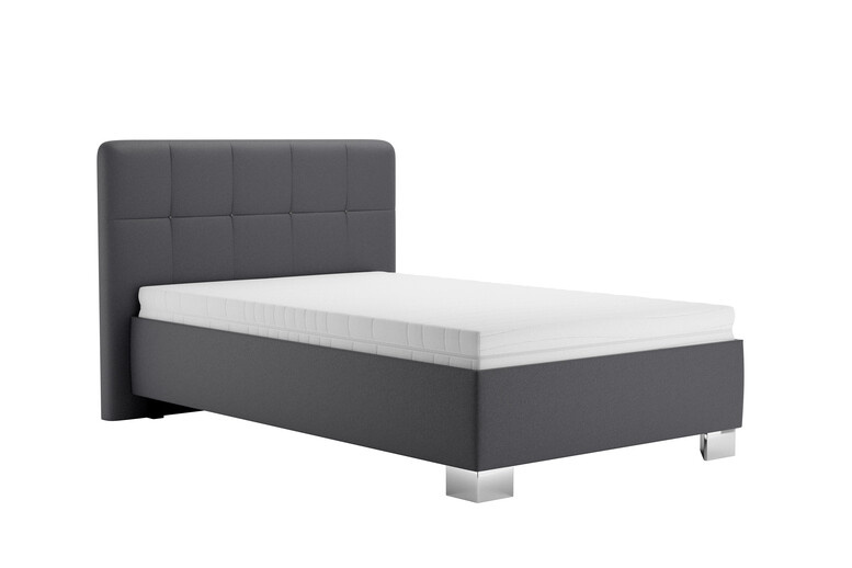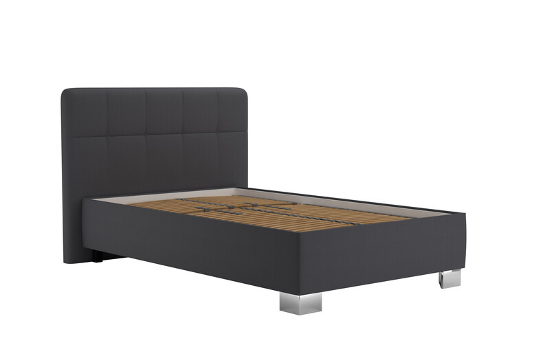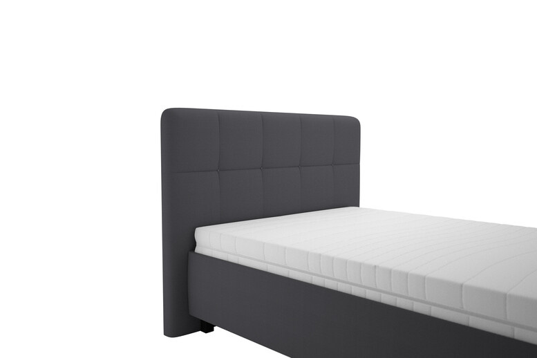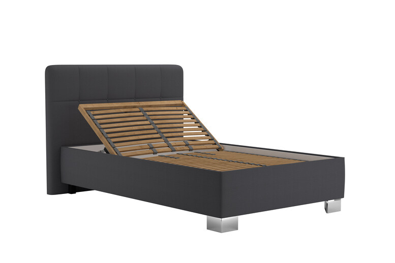 Moderní postel 120 x 200 cm se dodává bez matrace nebo s volně loženou sendvičovou matrací NELLY uloženou na polohovacím lamelovém roštu ( polohování hlava + nohy, 28 lamel, nastavení tuhosti, popruh proti přetížení ). Úložný prostor je přístupný od nohou. Otevírání úložného prostoru pomocí plynových pístů. Potahová látka - ENJOY 22 - anthra.