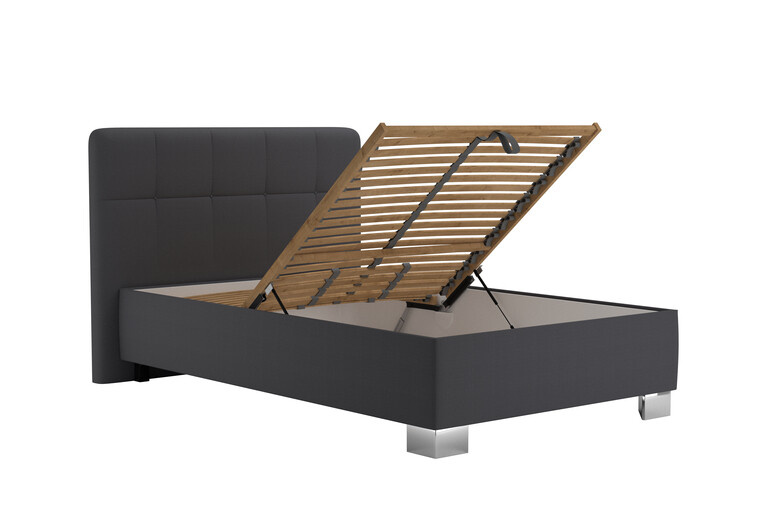 Moderní postel 140 x 200 cm se dodává bez matrace nebo s volně loženou sendvičovou matrací NELLY uloženou na polohovacím lamelovém roštu ( polohování hlava + nohy, 28 lamel, nastavení tuhosti, popruh proti přetížení ). Úložný prostor je přístupný od nohou. Otevírání úložného prostoru pomocí plynových pístů. Potahová látka - ENJOY 22 - anthra.
