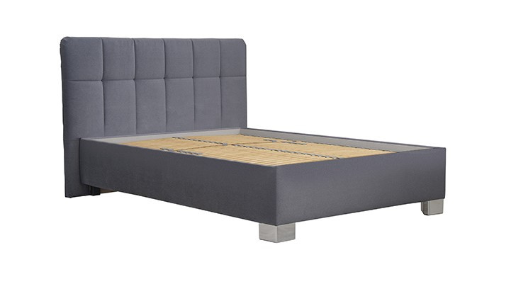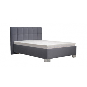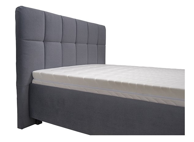 Kvalitní postel 140 x 200 cm se dodává bez matrace nebo s volně loženou sendvičovou matrací NELLY uloženou na polohovacím lamelovém roštu (polohování hlava + nohy, 28 lamel, nastavení tuhosti, popruh proti přetížení). Úložný prostor přístupný od nohou. Otevírání úložného prostoru pomocí plynových pístů. Potahová látka: šedá Eco kůže Loft grey